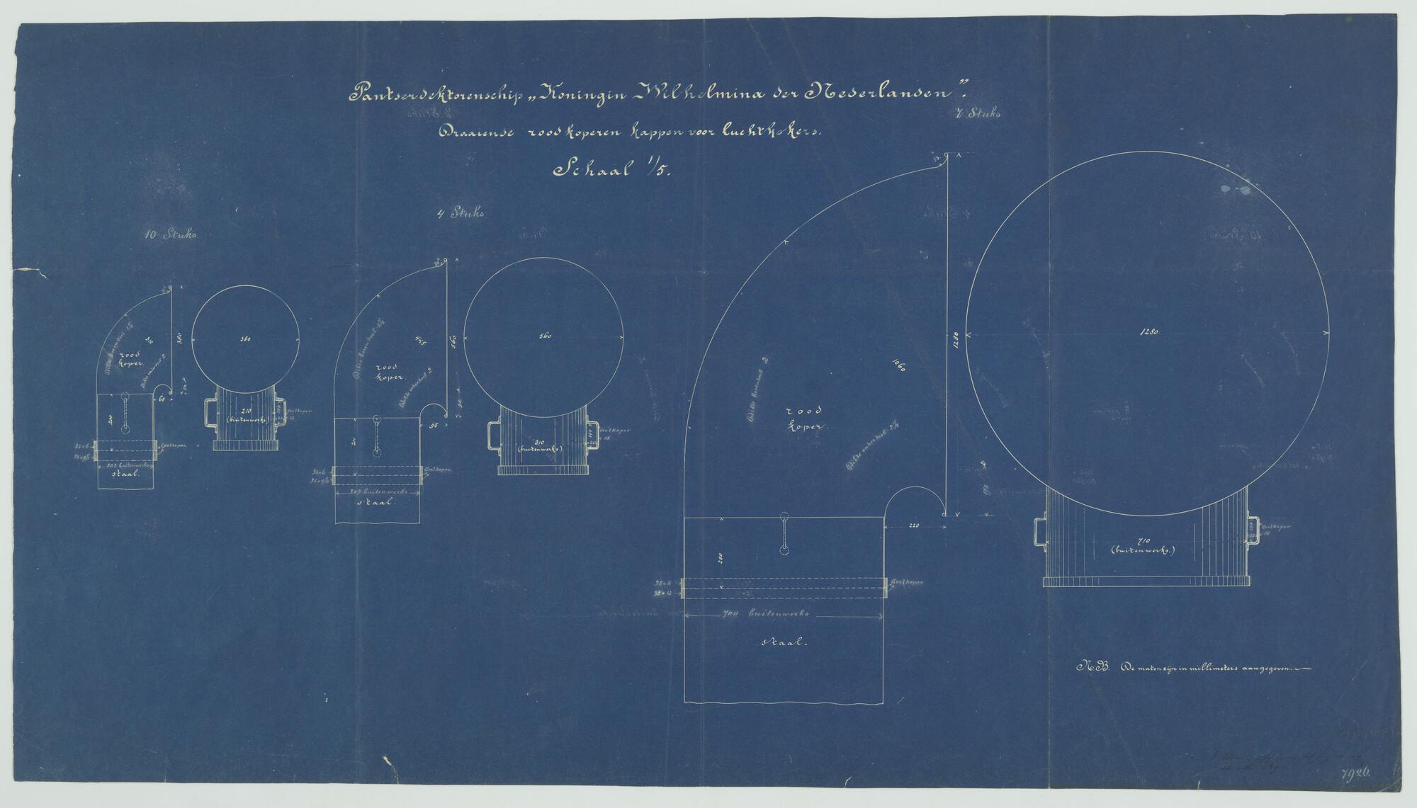 Diverse doorsneden van roodkoperen kappen voor luchtkokers van het pantserdektorenschip Hr.Ms. "Koningin Wilhelmina der Nederlanden" (schaal 1:5).