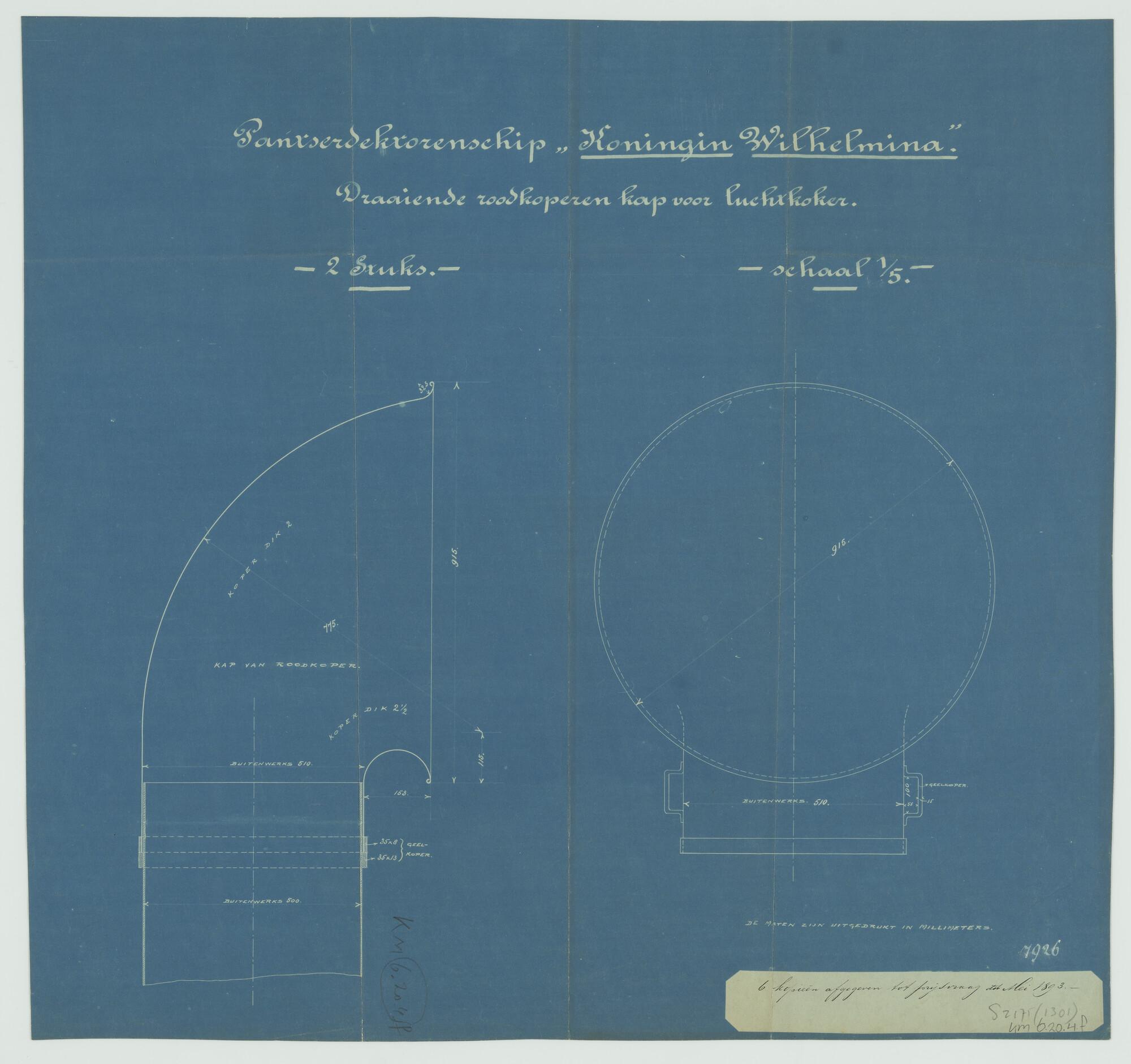 Pantserdektorenschip Hr.Ms. "Koningin Wilhelmina". Twee doorsneden van een draaiende roodkoperen kap voor een luchtkoker van het pantserdektorenschip Hr.Ms. "Koningin Wilhelmina der Nederlanden" (schaal 1:5).
