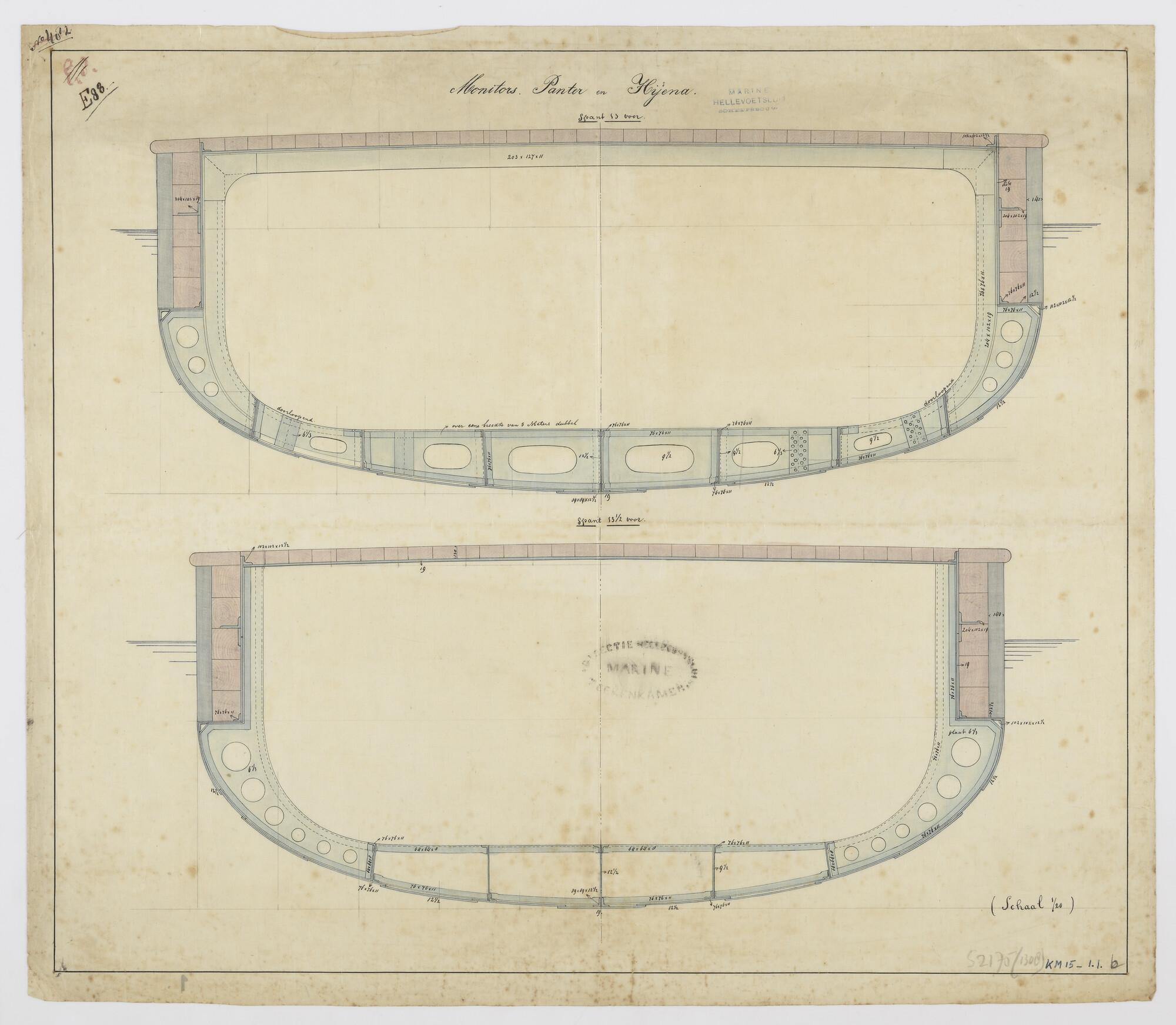 Monitors "Panter" en "Hyena". Twee dwarsdoorsneden op spanten 13 en 13 1/2 met waterlijn van de rammonitors 2de klasse Zr.Ms. "Hyena" en Zr.Ms. "Panter" (schaal 1:20).