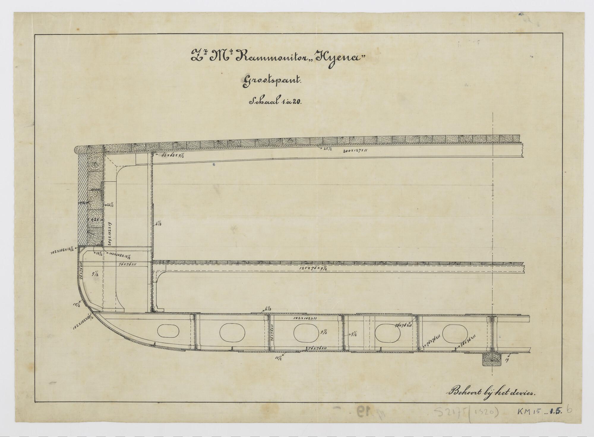 Dwarsdoorsnede van het halve grootspant van de rammonitor 2de klasse Zr.Ms. "Hyena". Pantsergordel met houten balken aan de binnenzijde. IJzeren opperdek en tussendek met hout belegd. Platte kiel met houten kielbalk (schaal 1:20).