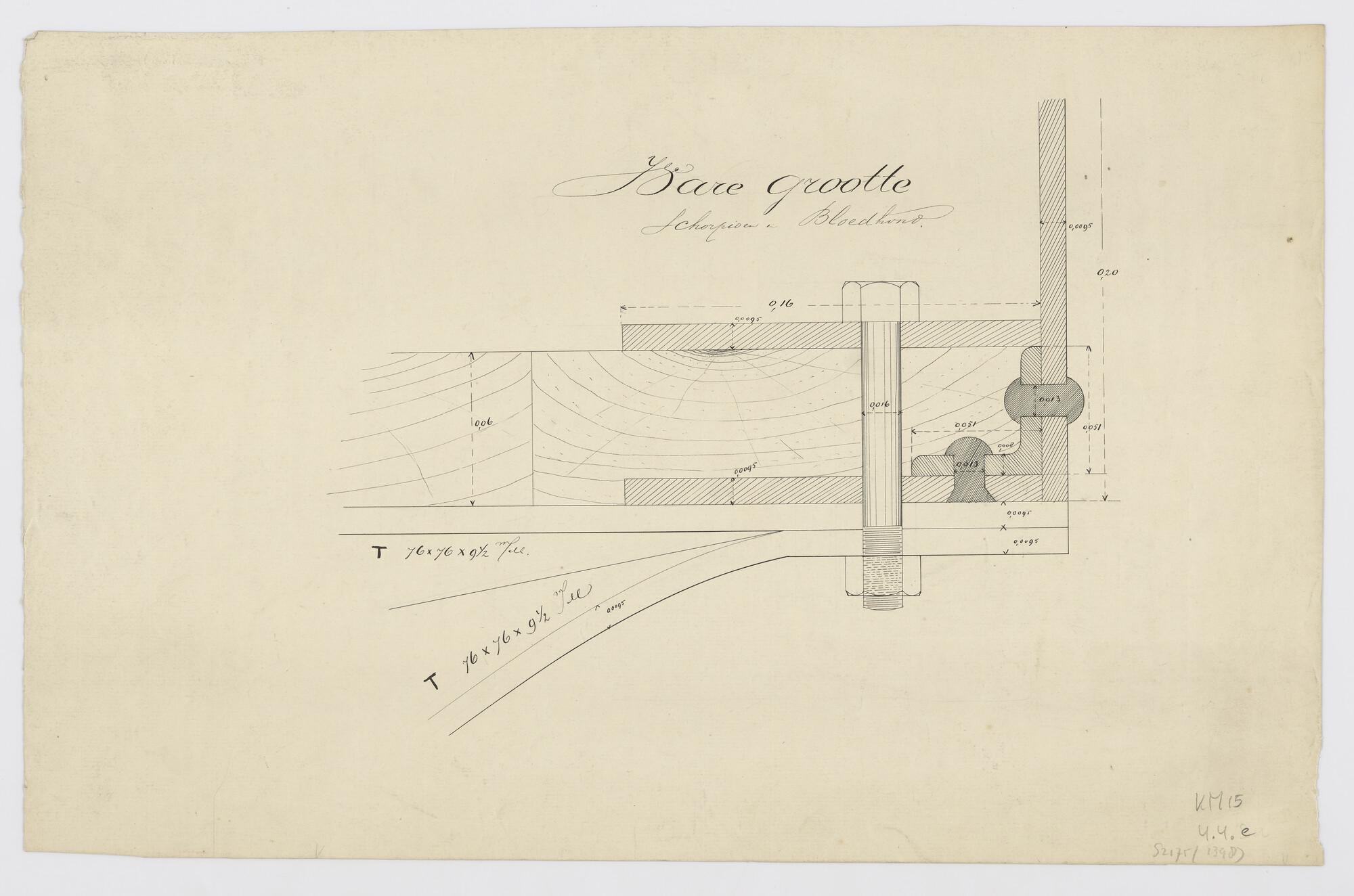 Detail van de geschutmars voor 2 kanons van 3.7 cm rev. van het ramschip Zr.Ms. "Schorpioen" en de geschutmars voor 1 kanon 3.7 cm rev. van de monitor 2de klasse Zr.Ms. "Bloedhond". Originele tekening (schaal in ware grootte).