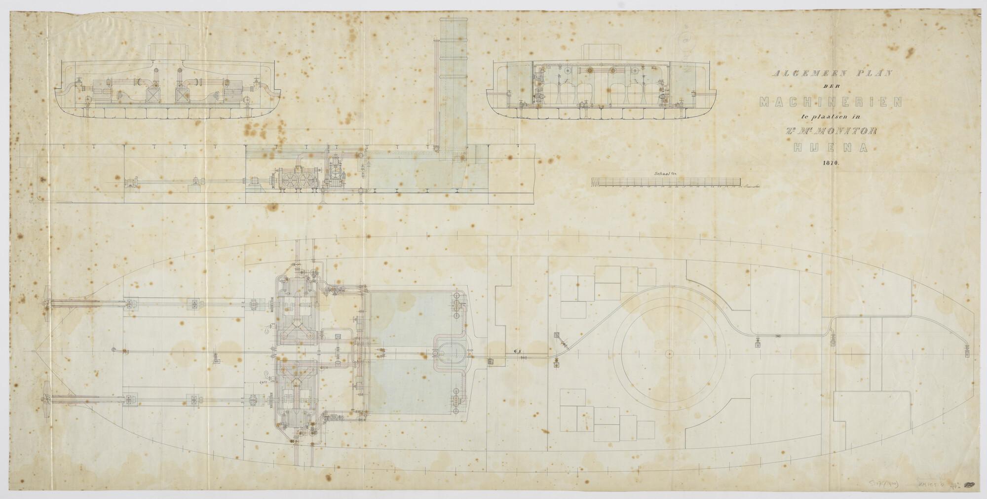 Verticale dwarsdoorsneden en -langsdoorsnede, bovenaanzicht van de rammonitor 2de klasse Zr.Ms. Hyena, met onder meer de machinekamer (het complete ruim) (schaal 1:40).