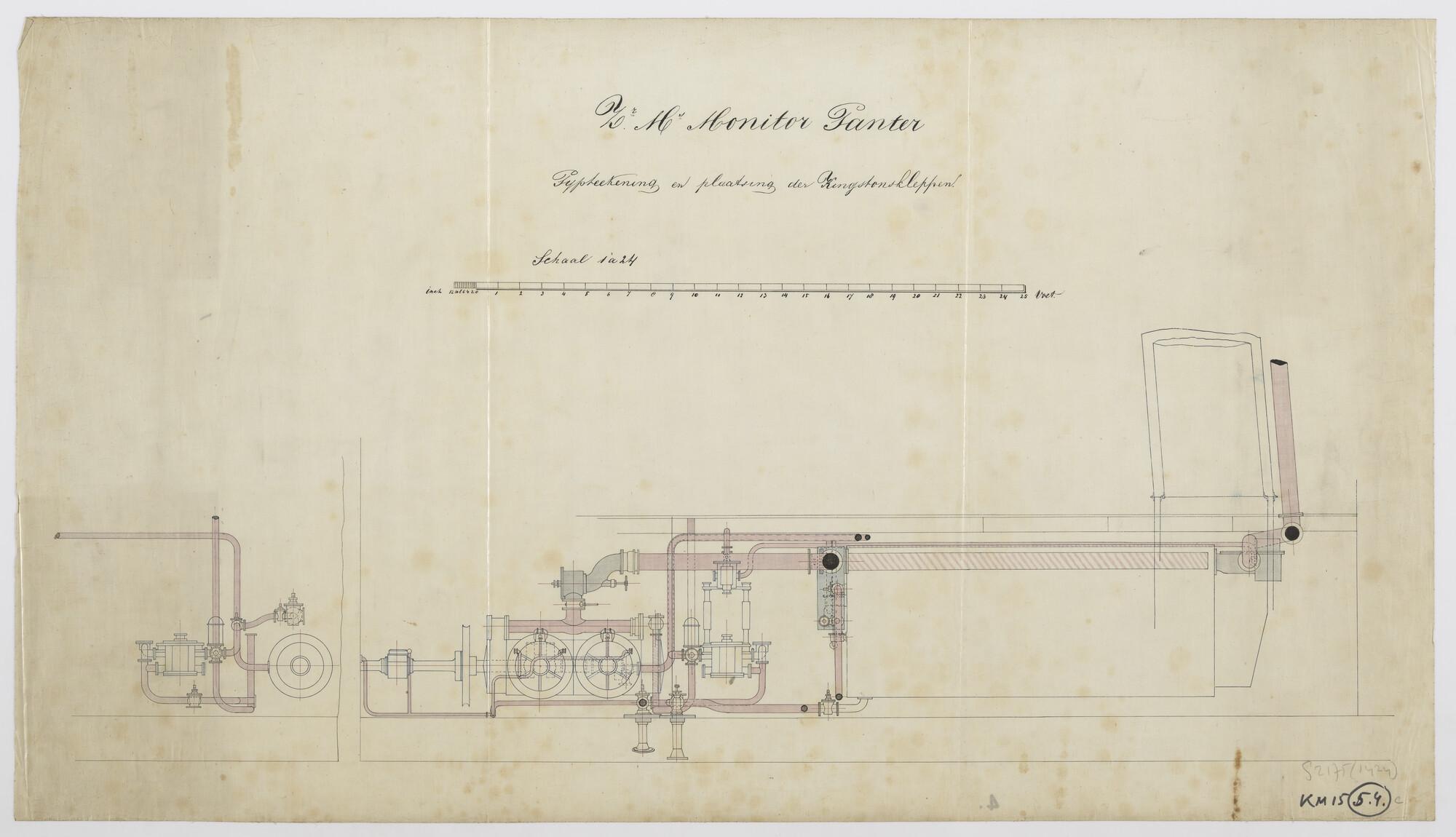 Pijpleiding en plaatsing der Kingstonskleppen in de machinekamer van de rammonitor Zr.Ms. Panter