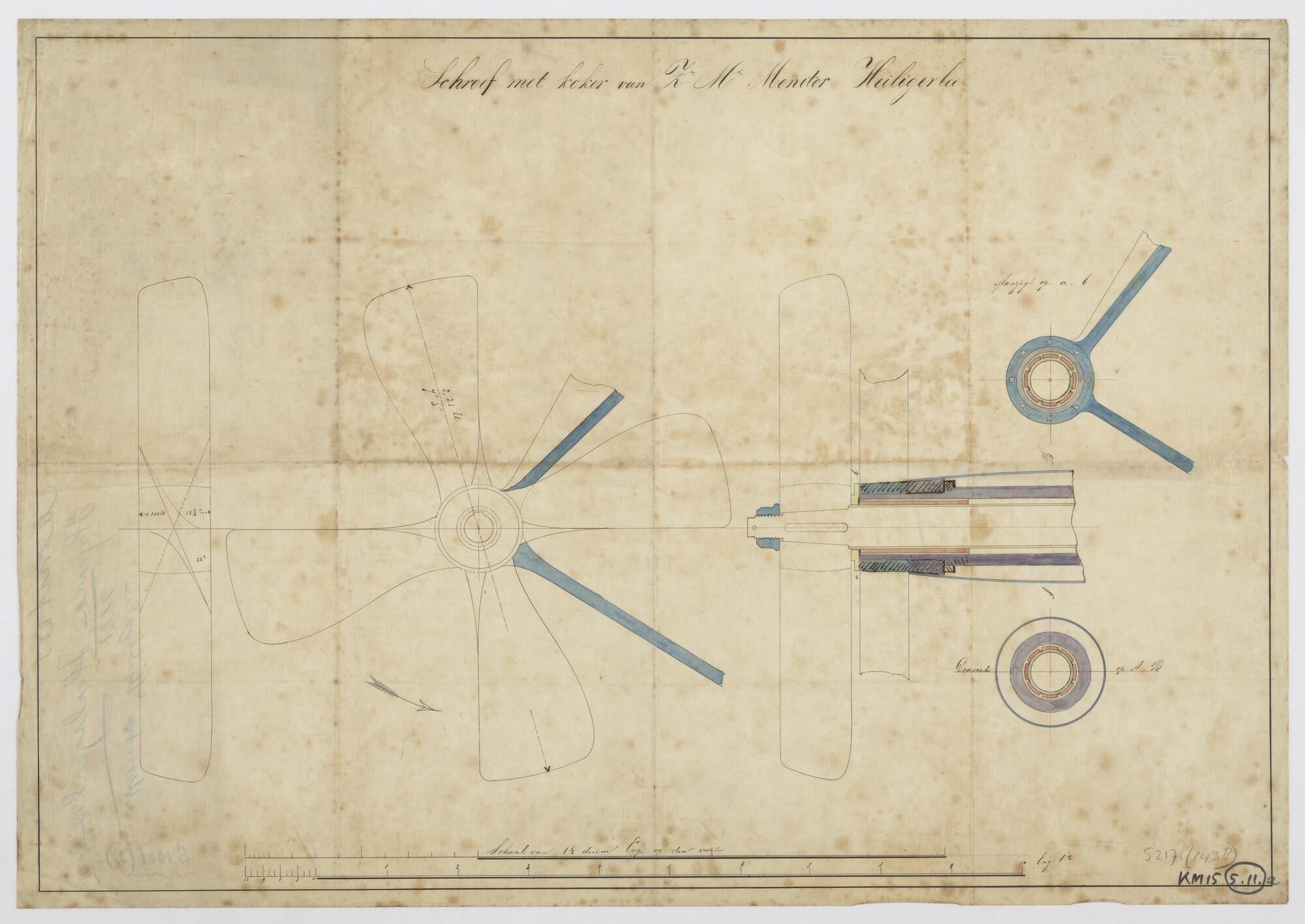 Schroef met laatste deel van de schroefaskoker van de monitor 2de klasse Zr.Ms. "Heiligerlee". Diverse doorsneden en aanzichten (schaal 1½ duim = 1 foot).