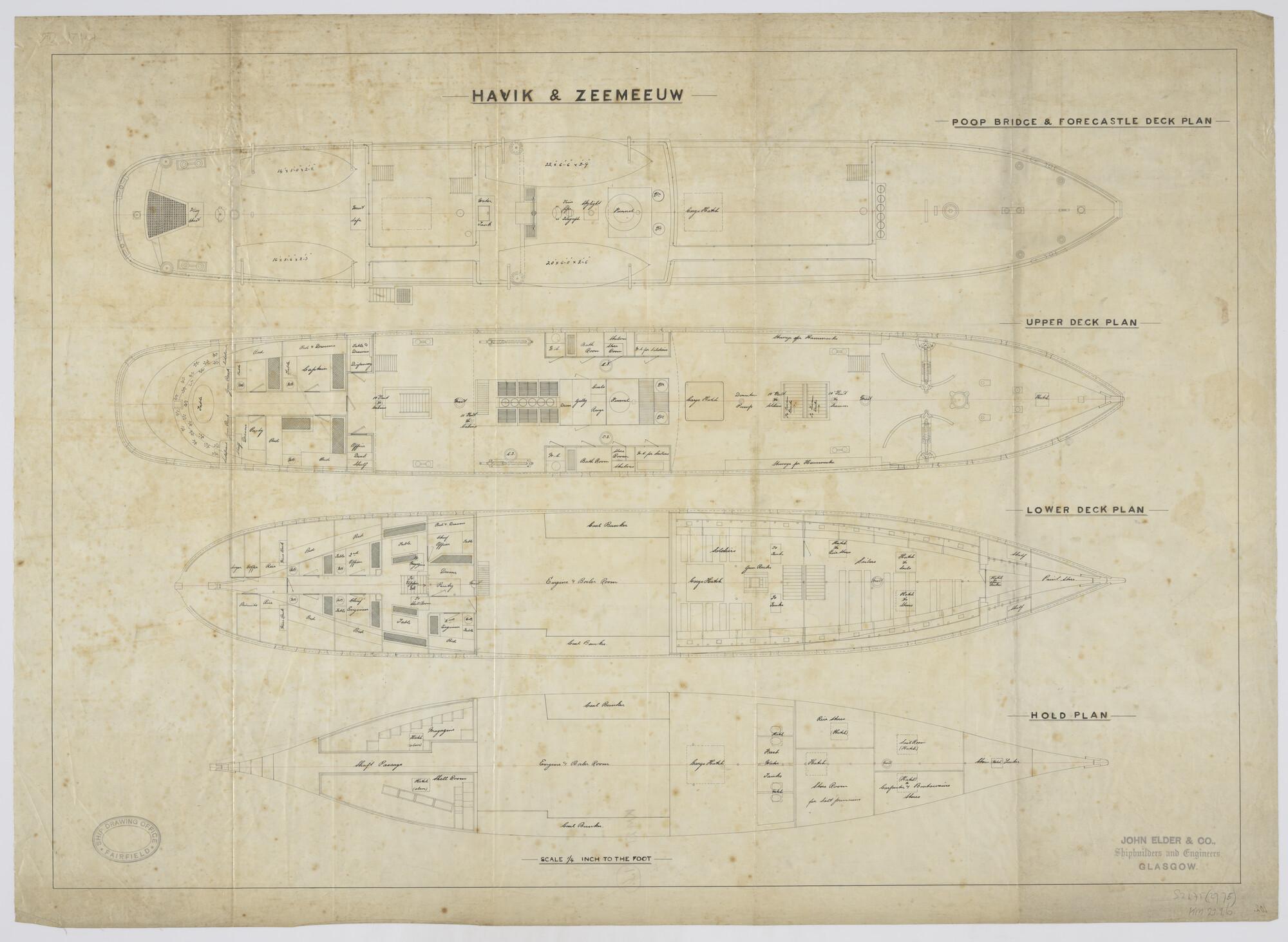 Indelingstekeningen van de kampanje, het brugdek, het bakdek, het bovendek, het tussendek en het ruim van de schroefstoomschepen voor de Gouvernementsmarine Zr.Ms. "Havik" en Zr.Ms. "Zeemeeuw". Accommodatie van de bemanning, machinekamer en ketels (schaal ¼ inch = 1 foot).