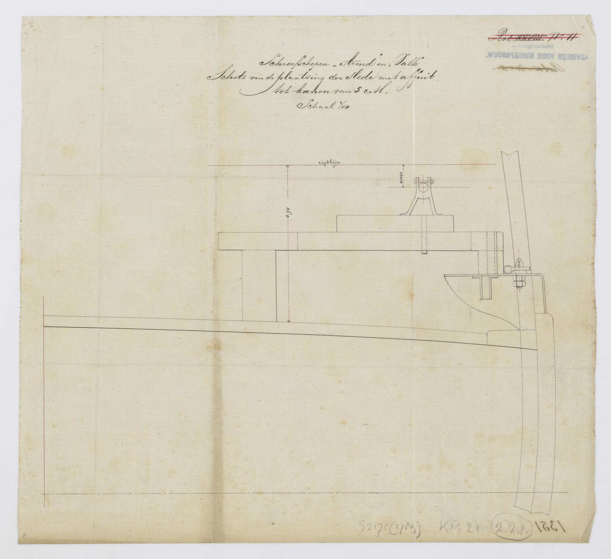 Halve dwarsdoorsnede over het bovendek met plaatsing van de slede met affuit tot het kanon van 5cm. van de schroefstoomschepen voor de Gouvernementsmarine Zr.Ms. "Arend" en Zr.Ms. "Valk" (schaal 1:1/10).