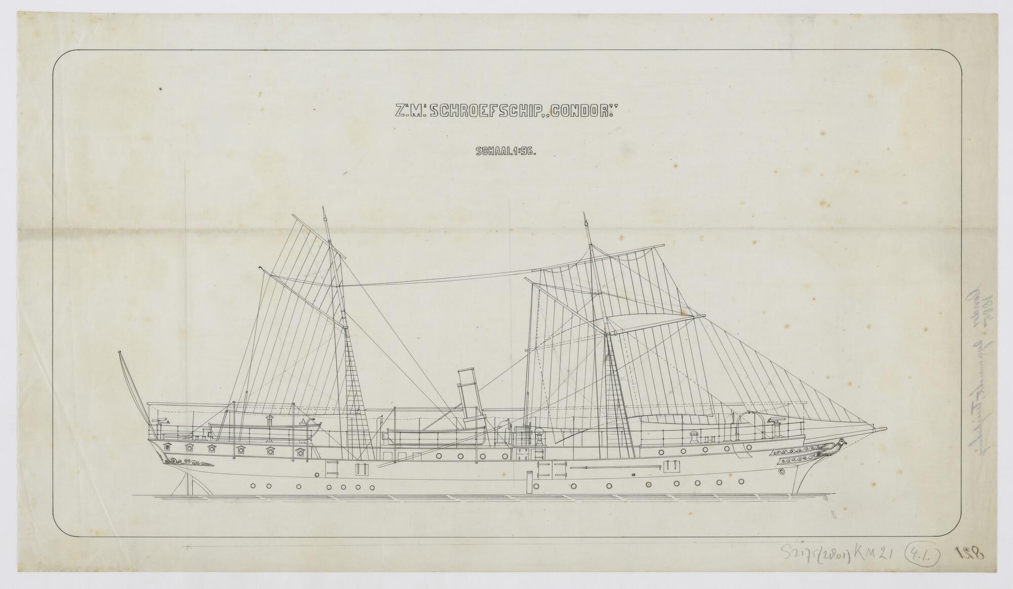Zeilplan van het schroefstoomschip voor de Gouvernementsmarine Zr.Ms. "Condor": zijaanzicht over stuurboord tot op de waterlijn met tuigage en zeilplan. Boeg- en spiegelversiering, twee masten, schoorsteen, sloepen, bewapening, brug met kompas en stuurwiel (schaal 1/96).