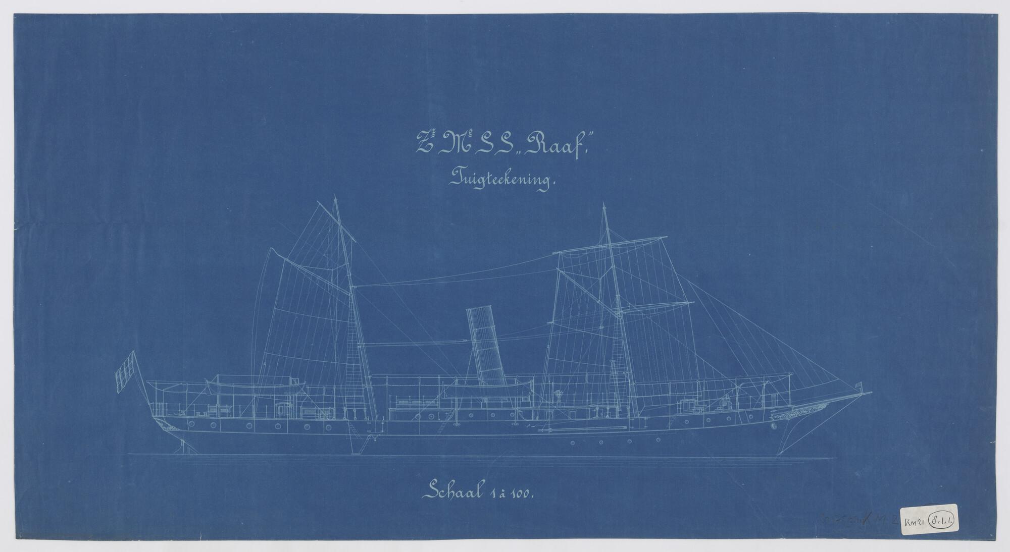 Zeilplan en tuigtekening van het schroefstoomschip voor de Gouvernementsmarine Zr.Ms. "Raaf". Twee masten, dekhuis, schoorsteen, ankerspil, lantaarns, sloepen, boeg- en achterstevenversiering (schaal 1:1/100).