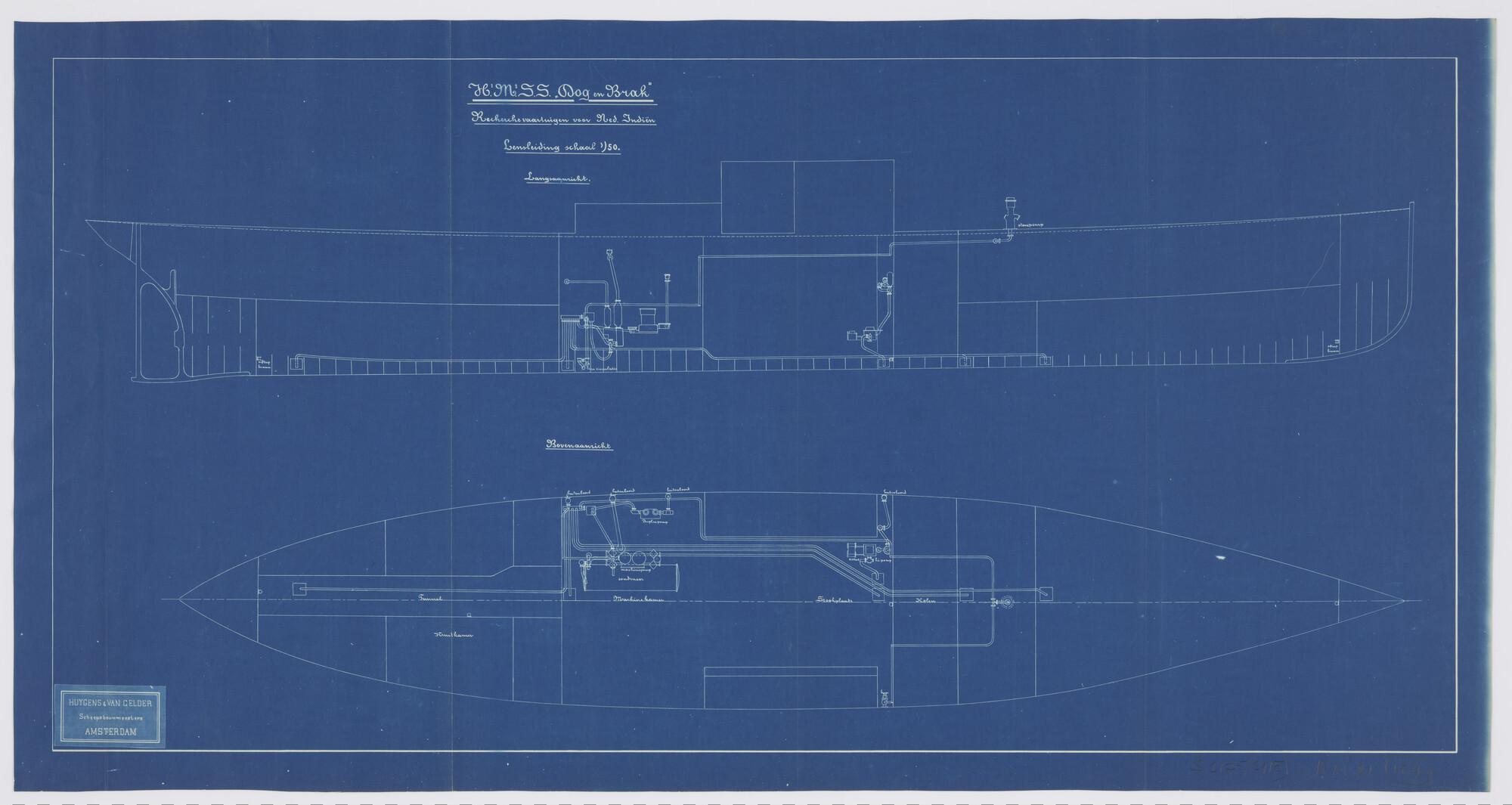 Langsscheepse doorsnede en horizontale doorsnede van het ruim van de stoomschepen voor de gouvernementsmarine Hr.Ms. Dog en Hr.Ms. Brak (recherchevaartuigen voor Nederlands-Indië - gewest Atjeh). Met lensleiding, lenspompen en afsluiters (schaal 1:50).