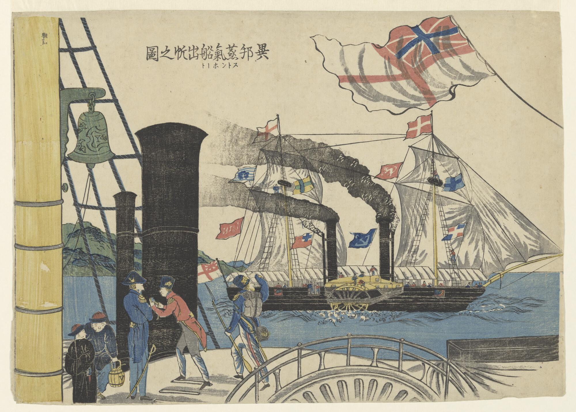 Nagasaki-prent: twee Engelse raderstoomschepen verlaten een Japanse haven; het voorste schip is slechts gedeeltelijk zichtbaar.