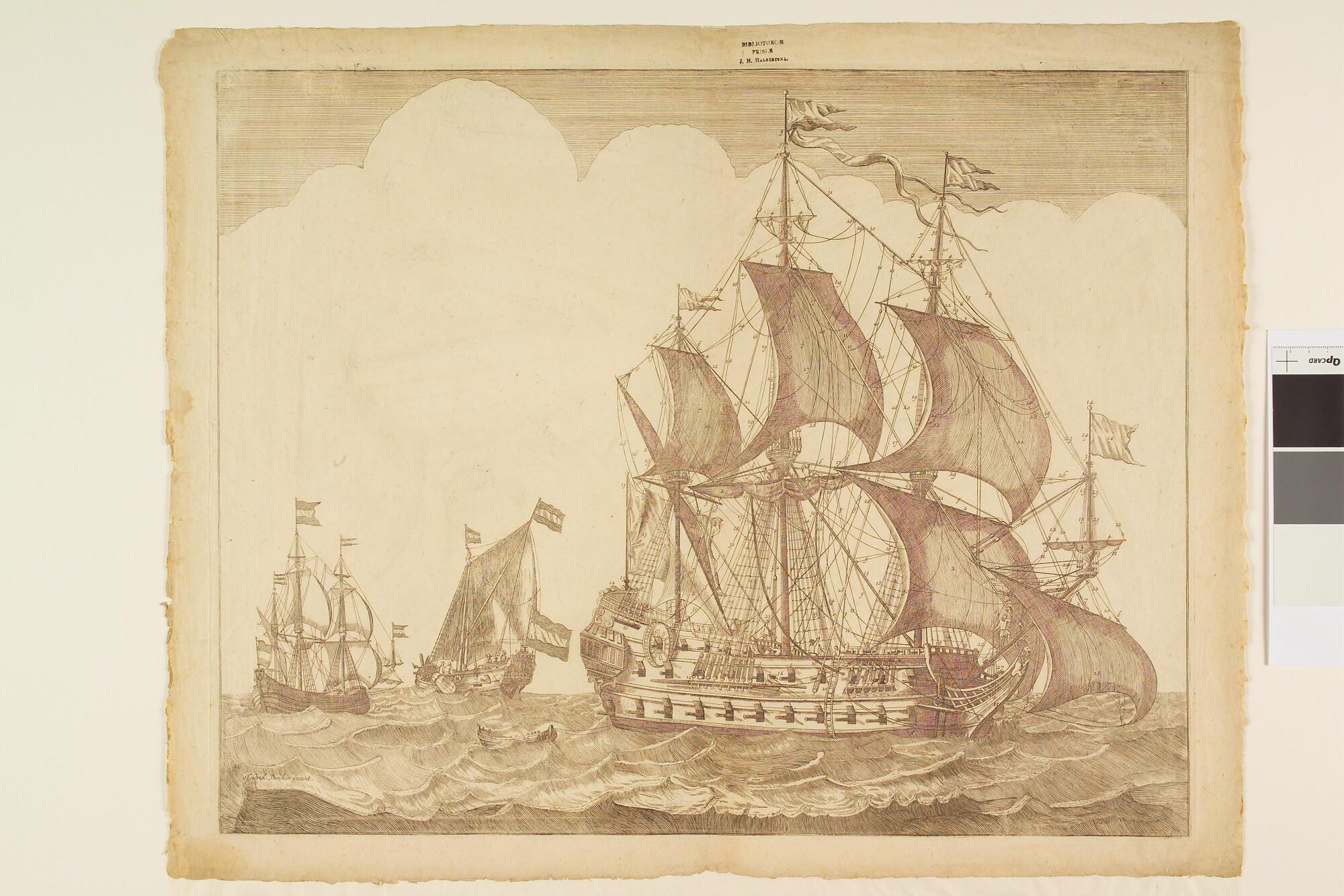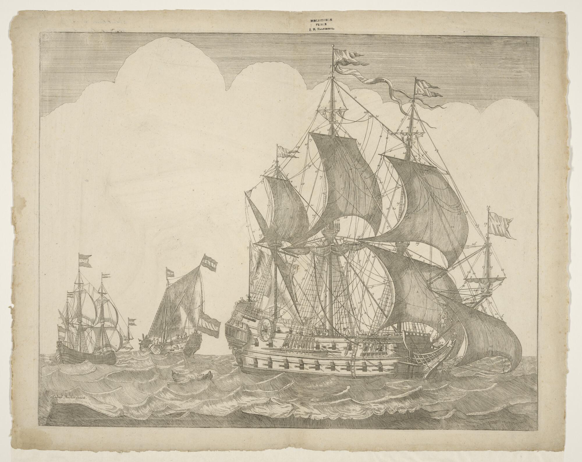 Hollands oorlogsschip van zestig stukken gezien van stuurboord. Naar links een statenjacht en een fluitschip