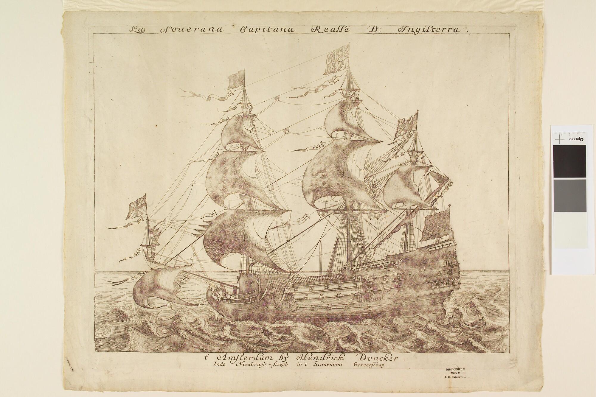 Engels oorlogsschip met drie dekken, "The Royal Sovereign", gezien van bakboord
