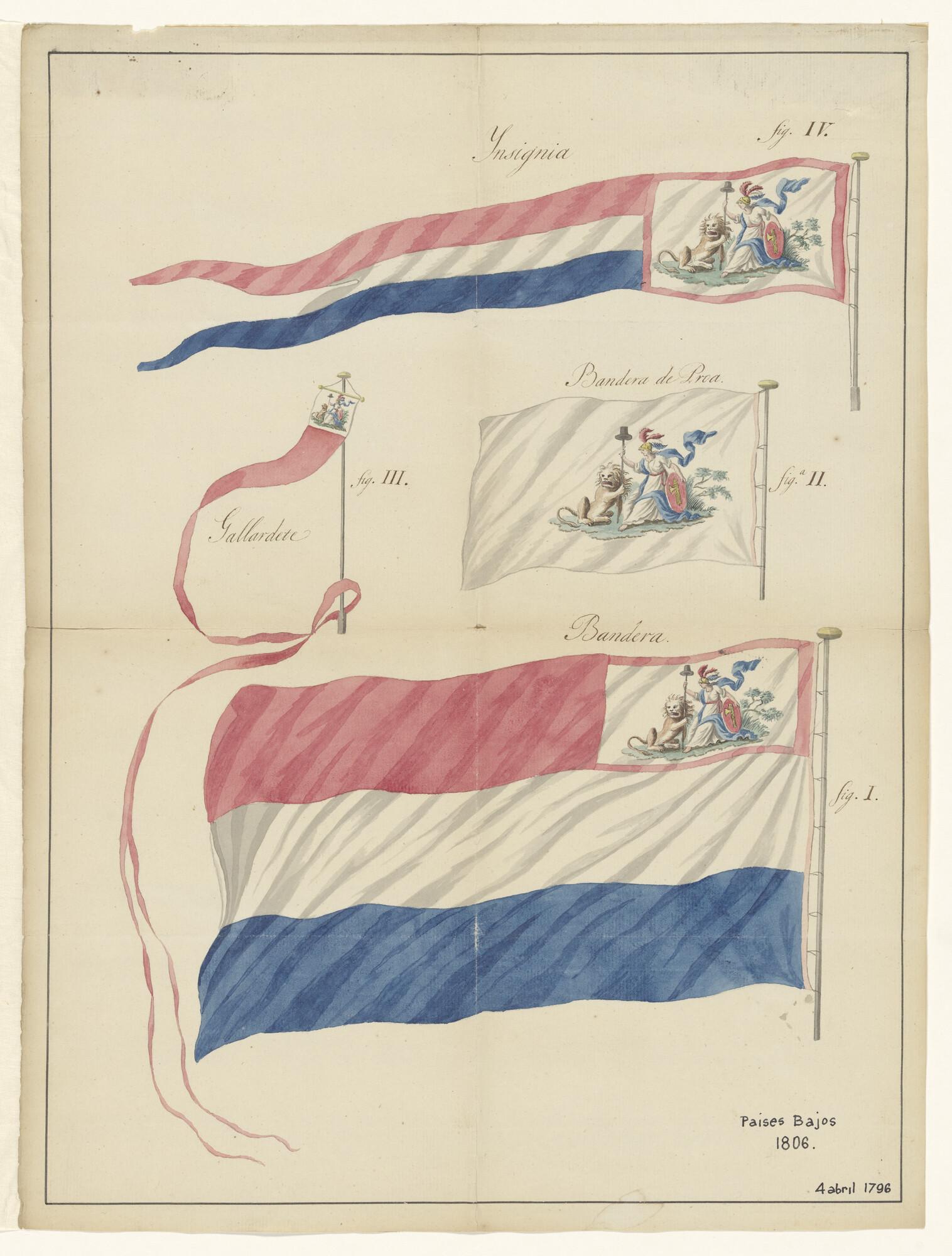 Afbeeldingen van de Marine van de Bataafsche Republiek op last van het comité van Marine vervaardigde vlaggen. [Met Spaanse tekst].