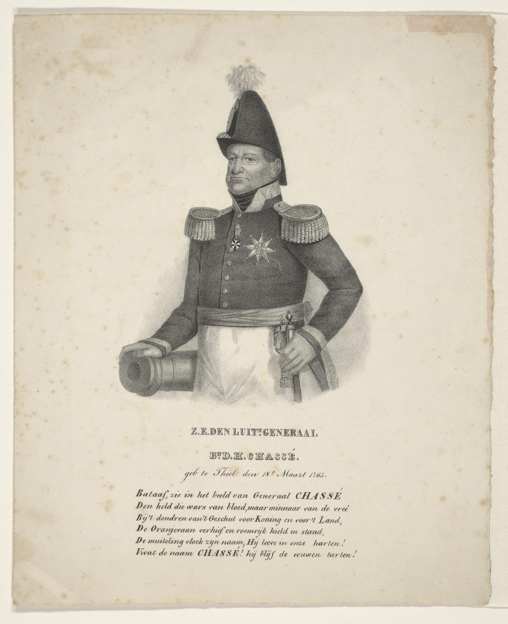 Portret van Generaal D.H. Baron Chassé. te halver lijve links, staande bij een kanon, met steek en het grootkruis van de Militaire Willems-Orde.