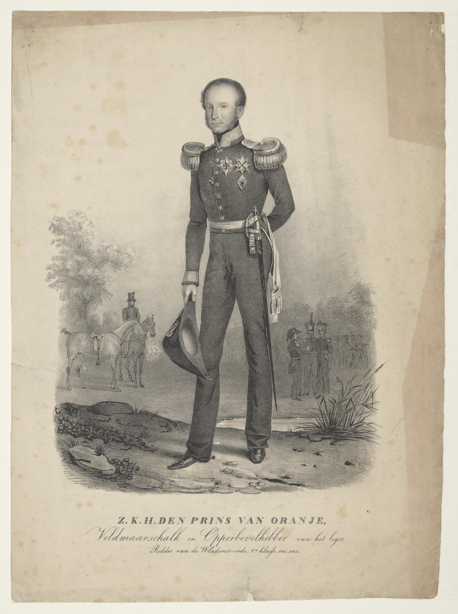 Portret van Koning Willem II als kroonprins. Links staande in het open veld met steek in de hand.