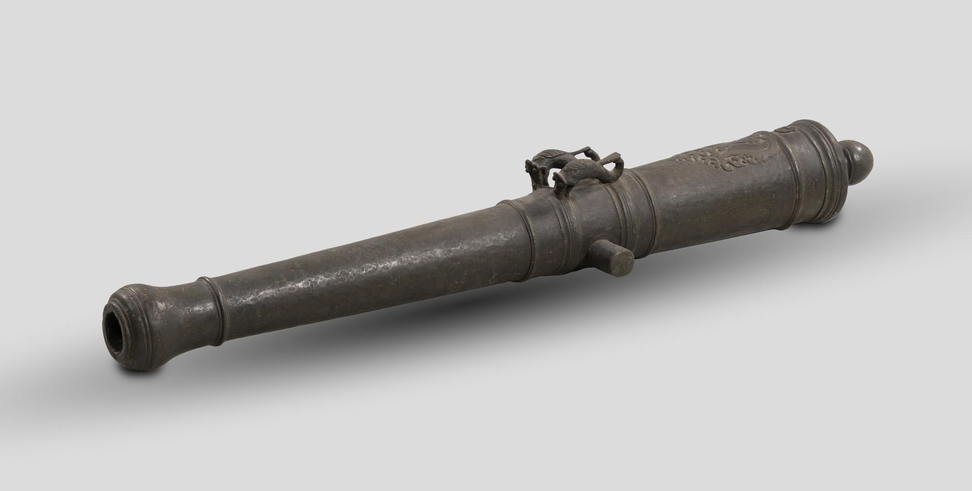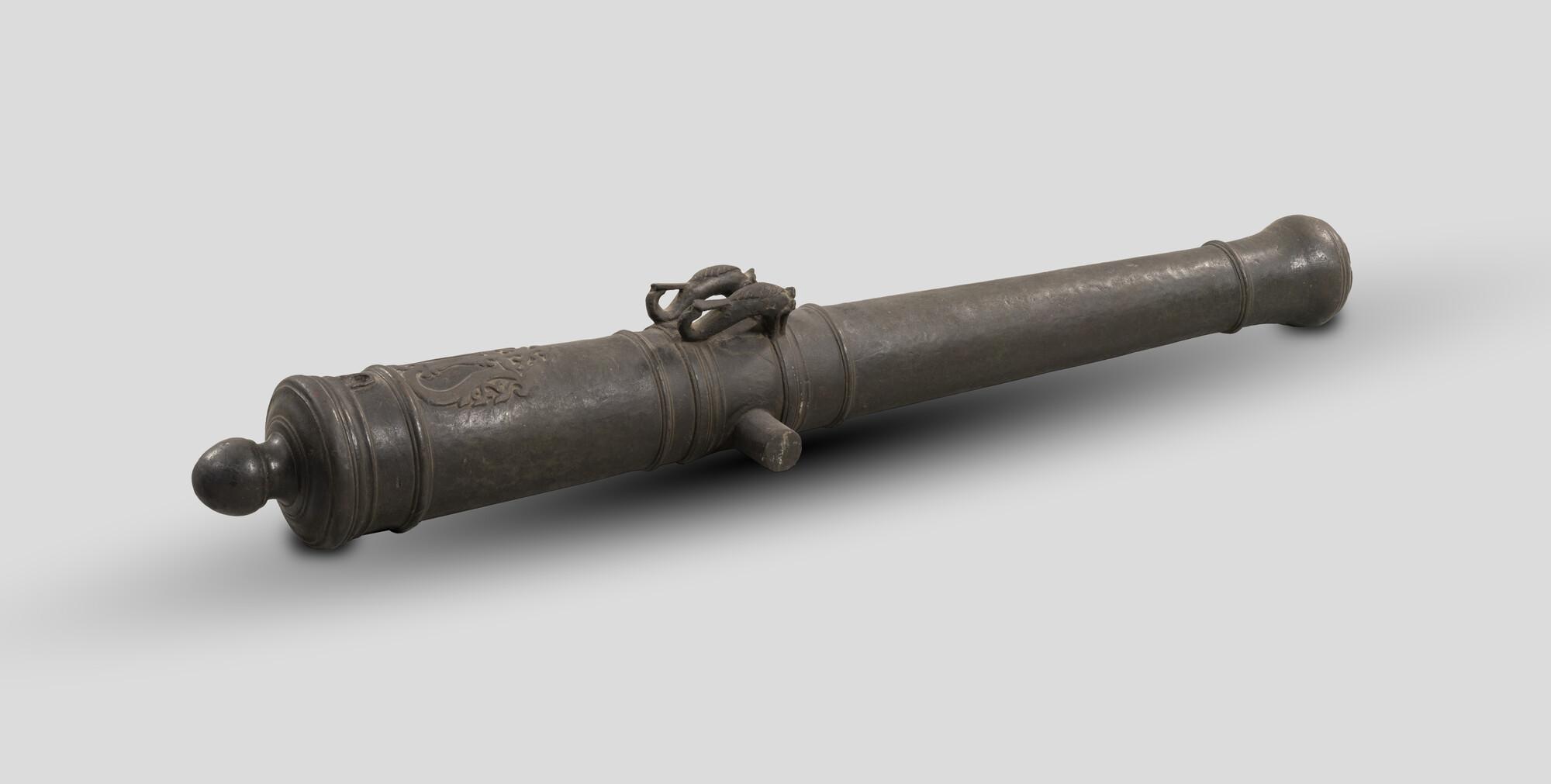 Kanon met twee oren in de vorm van dierenkoppen. Voor het zundgat een figuur in de trant van een wapenschild.
