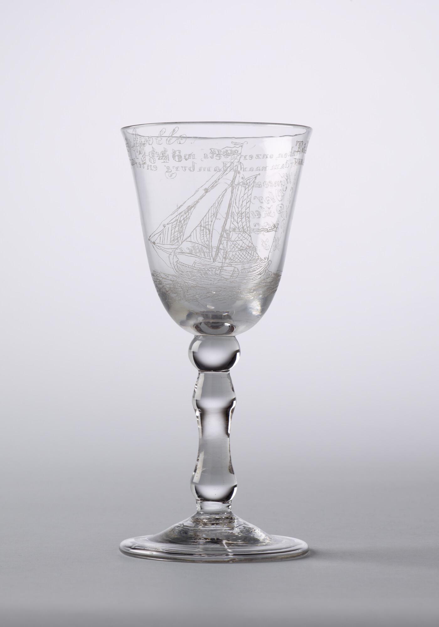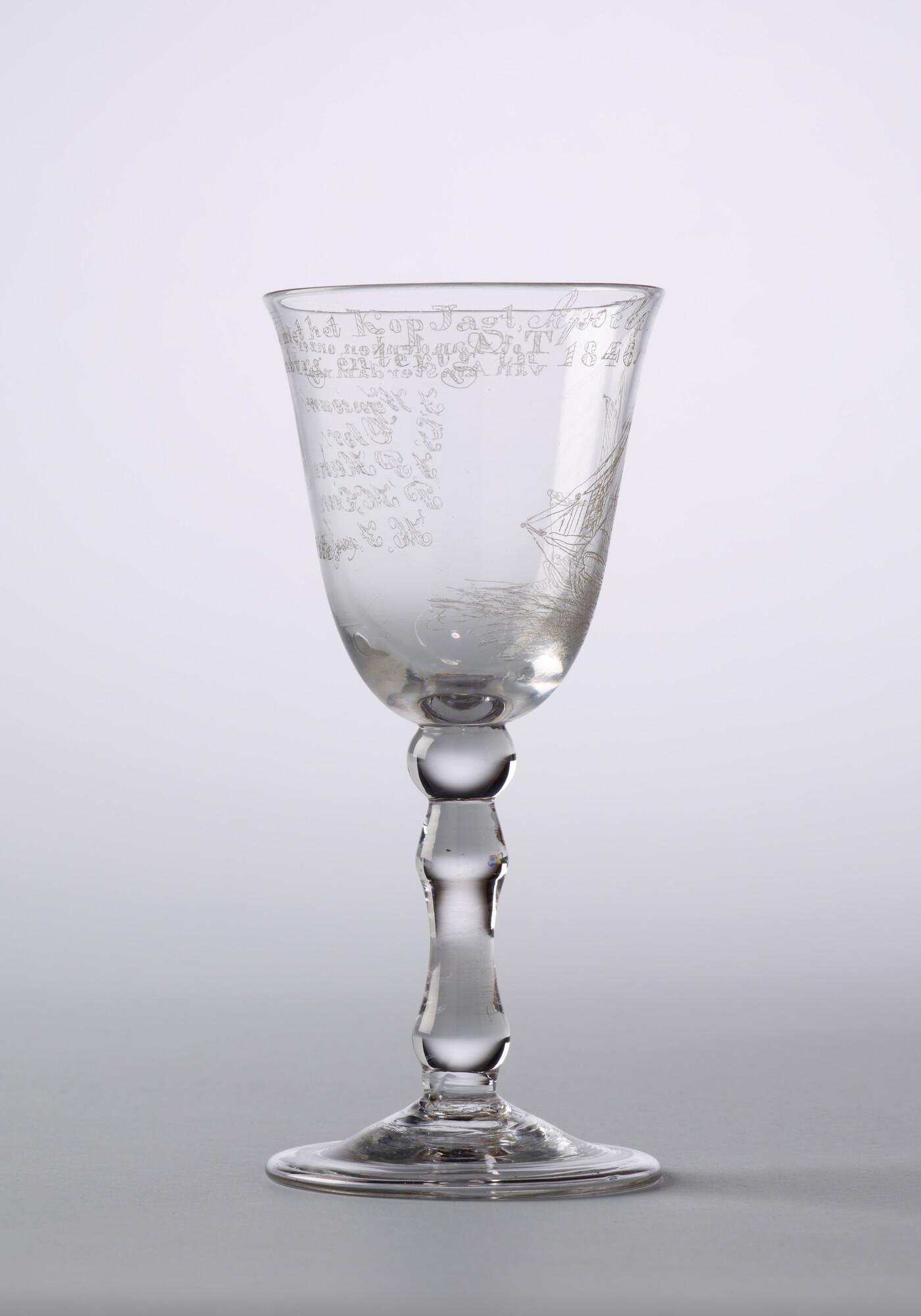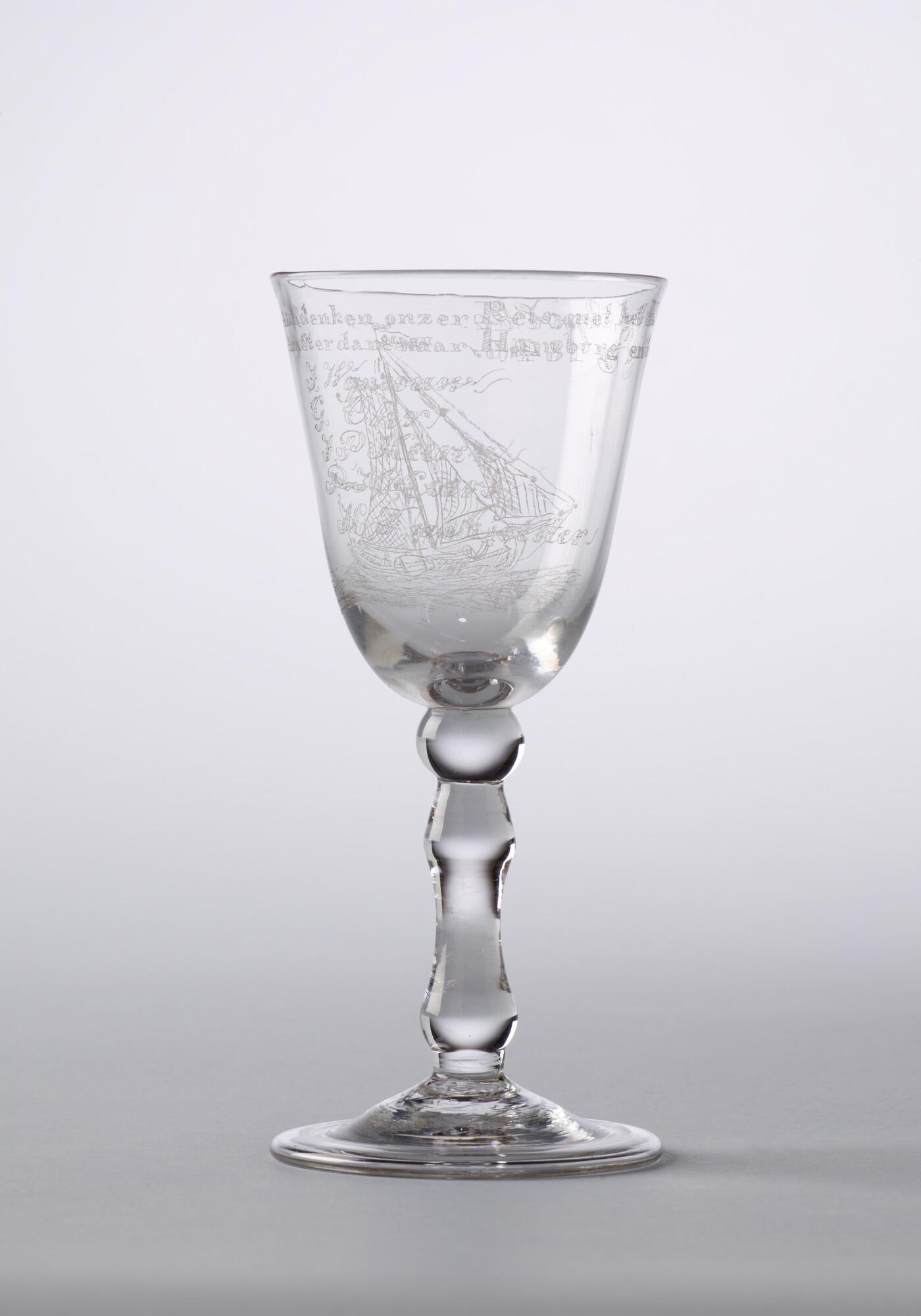 Kelkglas met een diamantgravure van het kopjacht 'Apollo' en het opschrift "ter herinnering aan de reis van Amsterdam naar Hamburg".