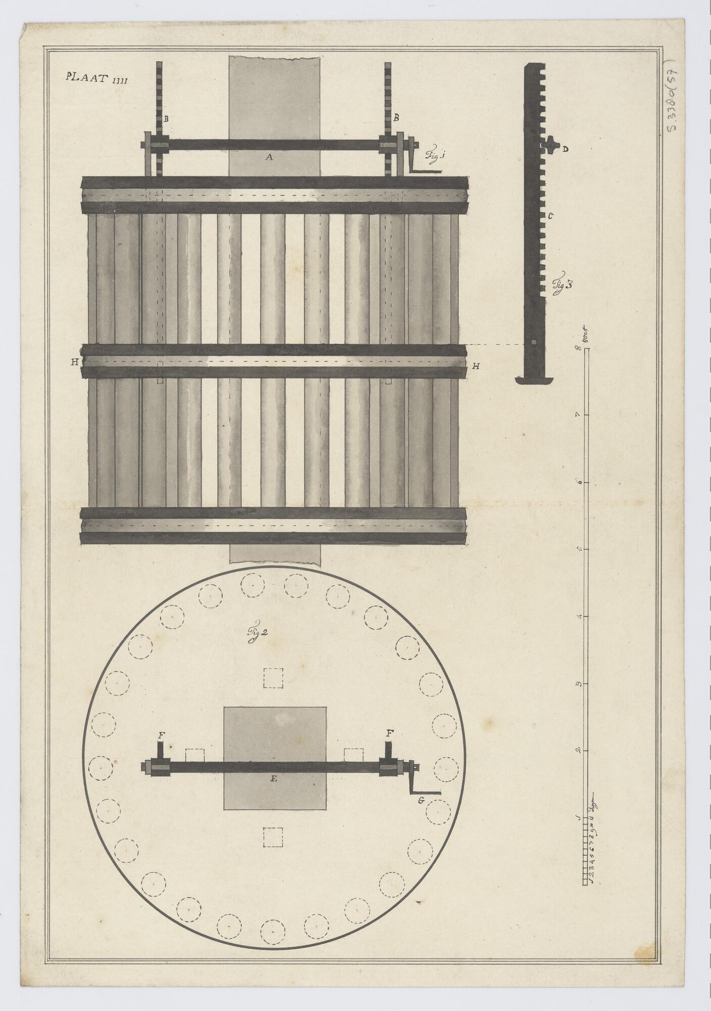 Detailtekening. Constructietekening van een molen voor een prijsvraag voor een wind- en watermolen in 1793.
