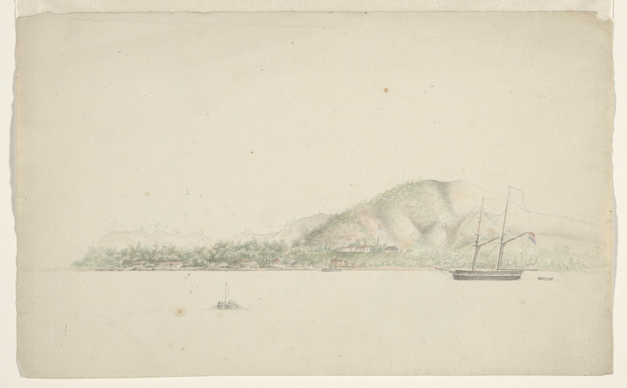 Een oorlogsschoener voor anker op een rede in Nederlands Indië