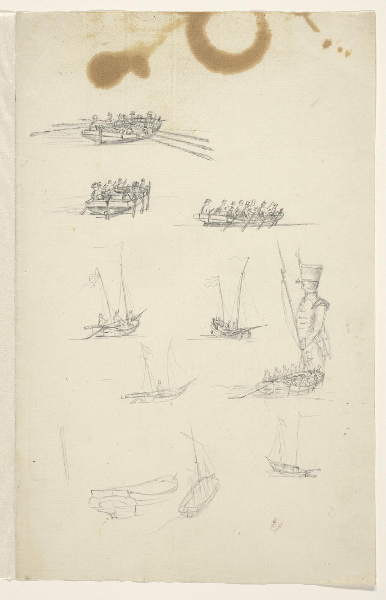 Schetsblad met roei- en zeilschepen en een soldaat met geweer met bajonet.
