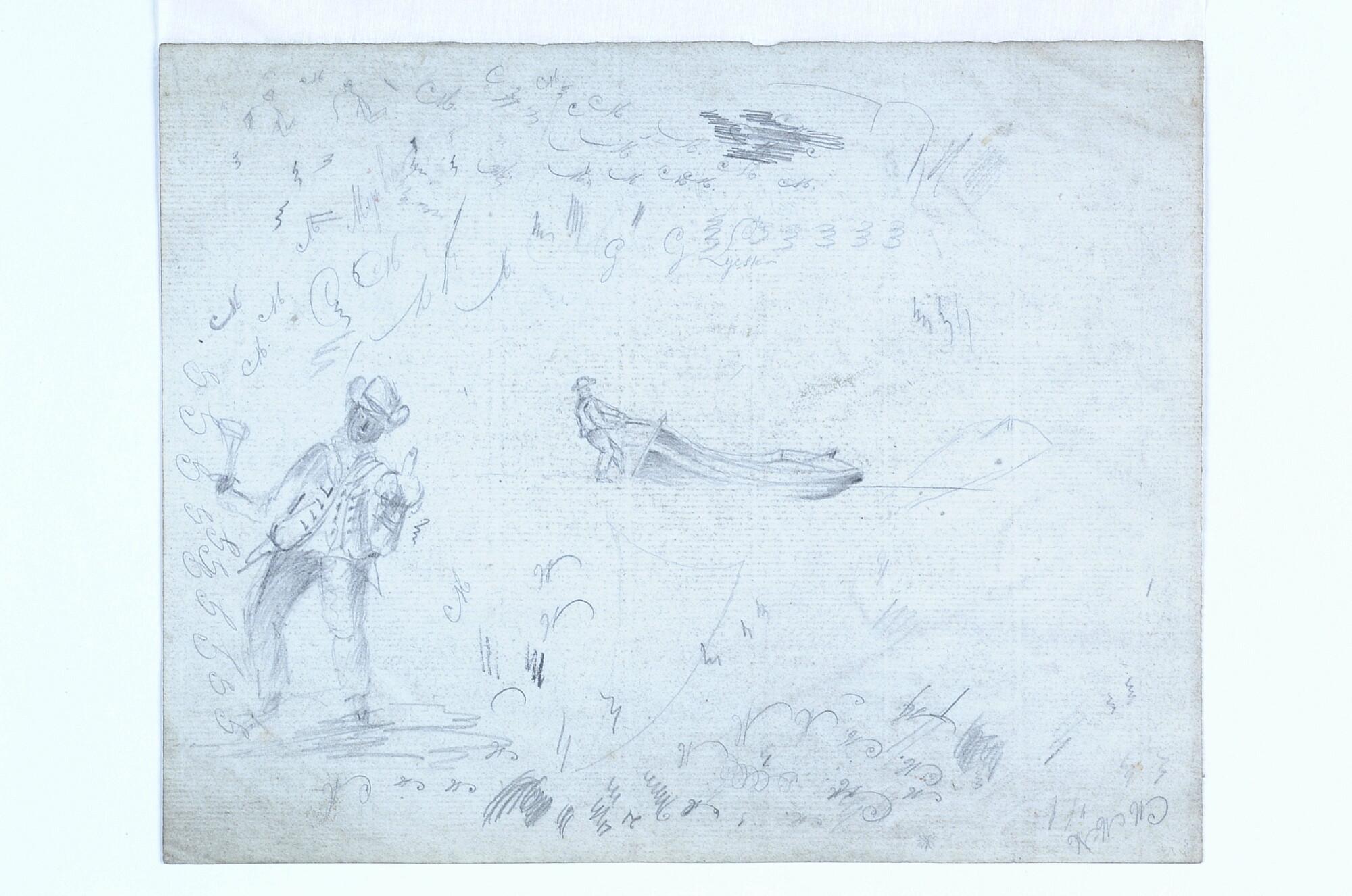 Schetsblad met een vrolijke zeeman met wijnfles en wijnglas, een man die een roeiboot trekt en diverse krabbels.