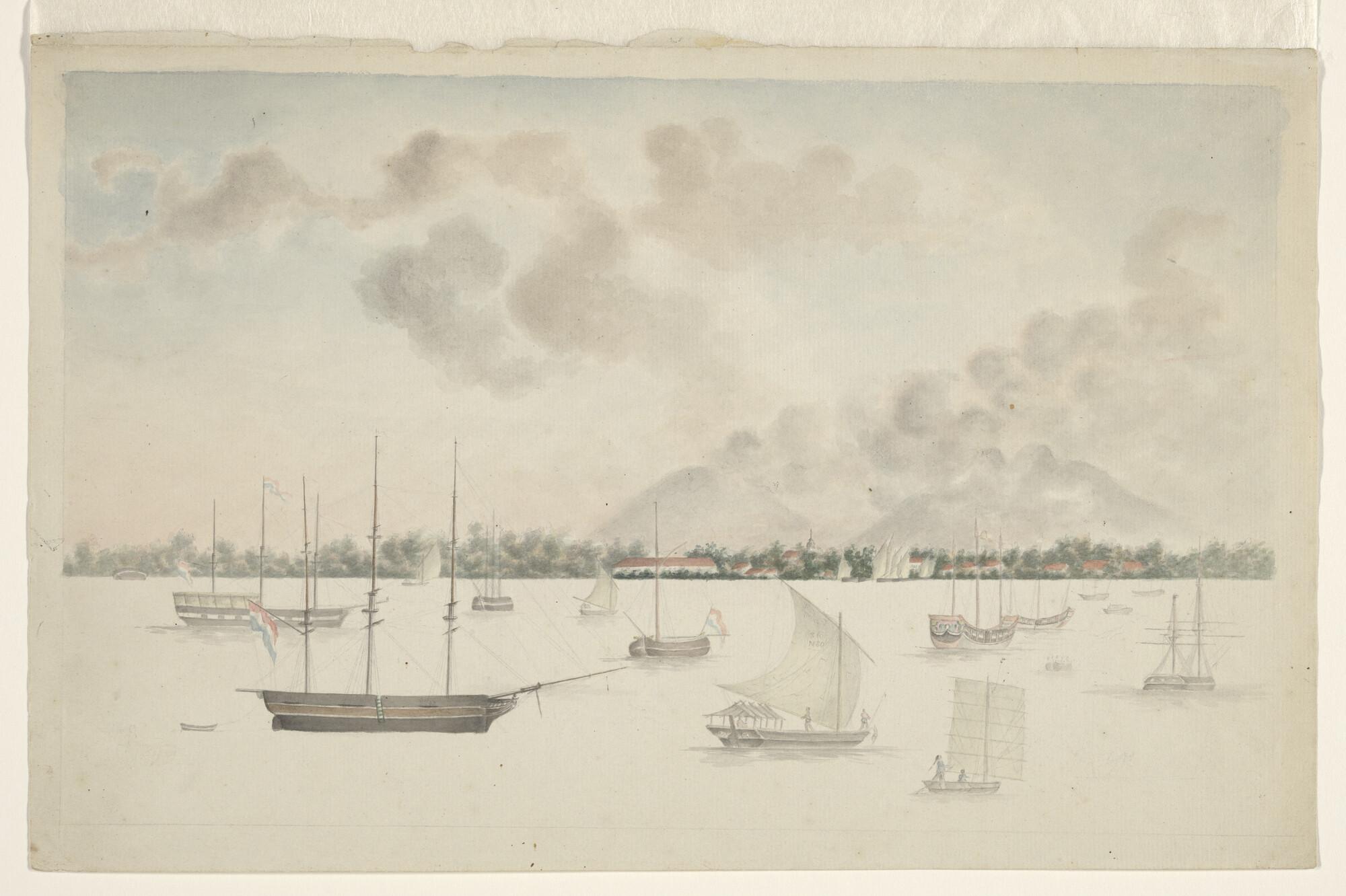 Nederlandse oorlogsschepen en inheemse vaartuigen op een rede in Oost-Indië