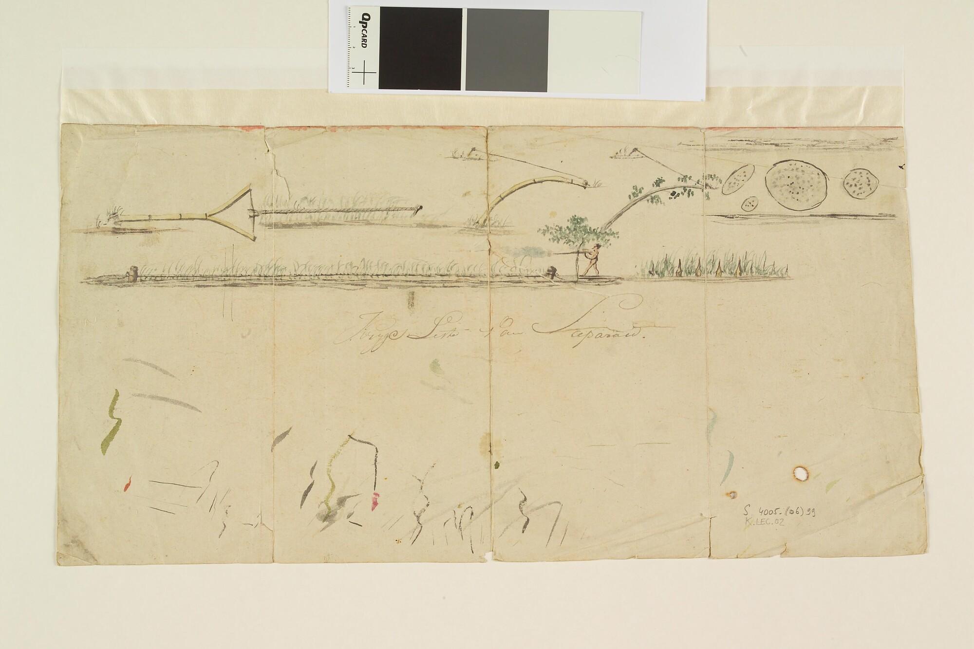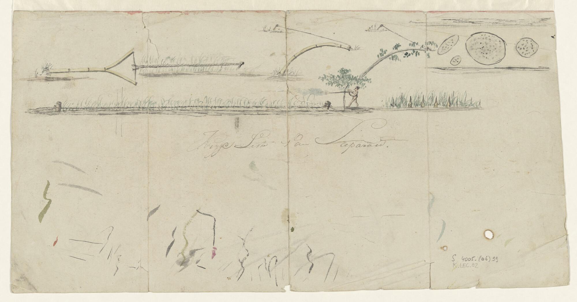 Krijgslisten van het eiland Saparoea: kladblad met een figuurtje met pijl en boog en studies voor een katapult; verso: krassen en verfstrepen