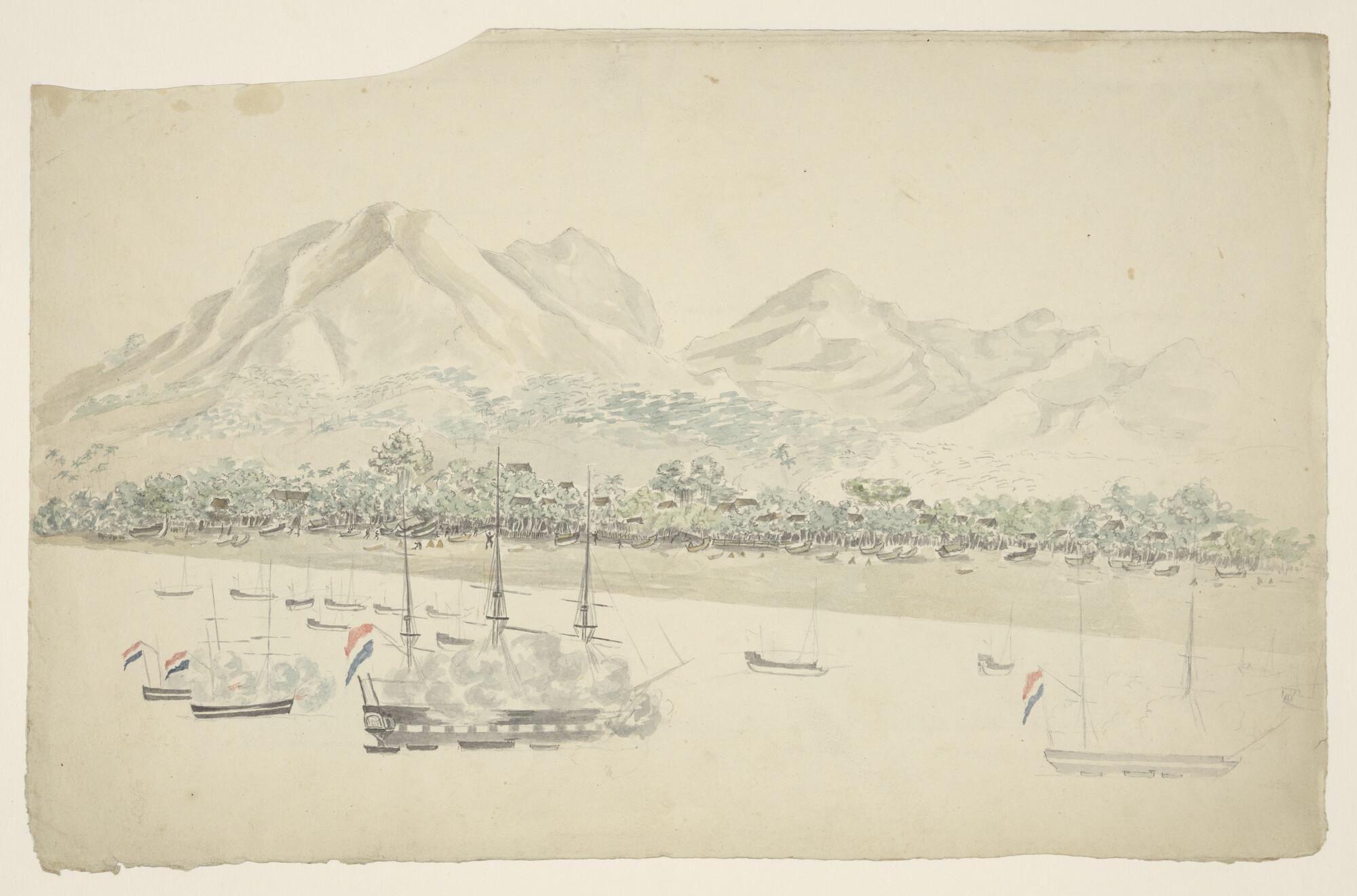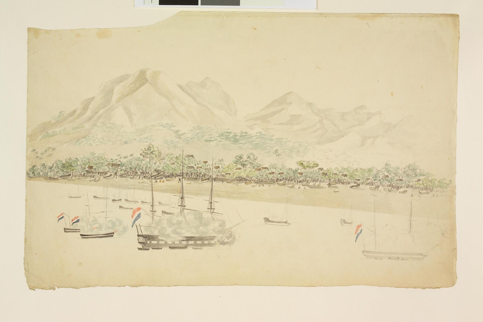 Beschieting van een nederzetting in Oost-Indië door een Nederlands eskader; op de achtergrond hoge bergen