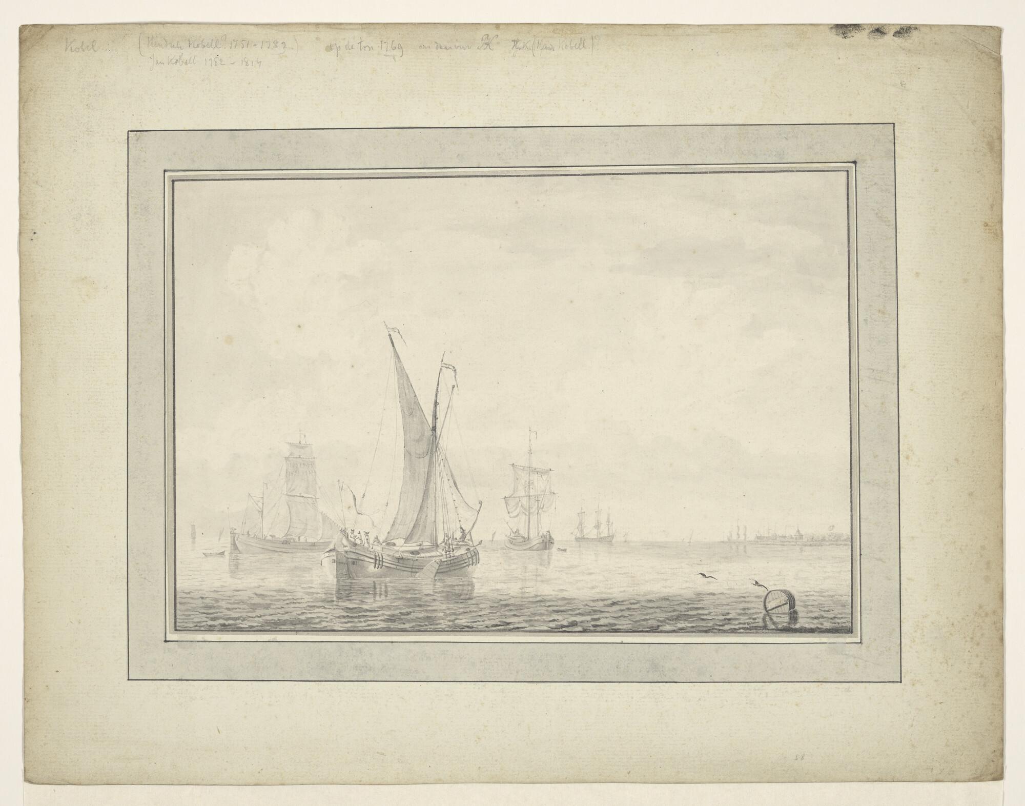 Scheepvaart op een rede, op de voorgrond een beurtschip [hektjalk] daarachter twee hoekers.