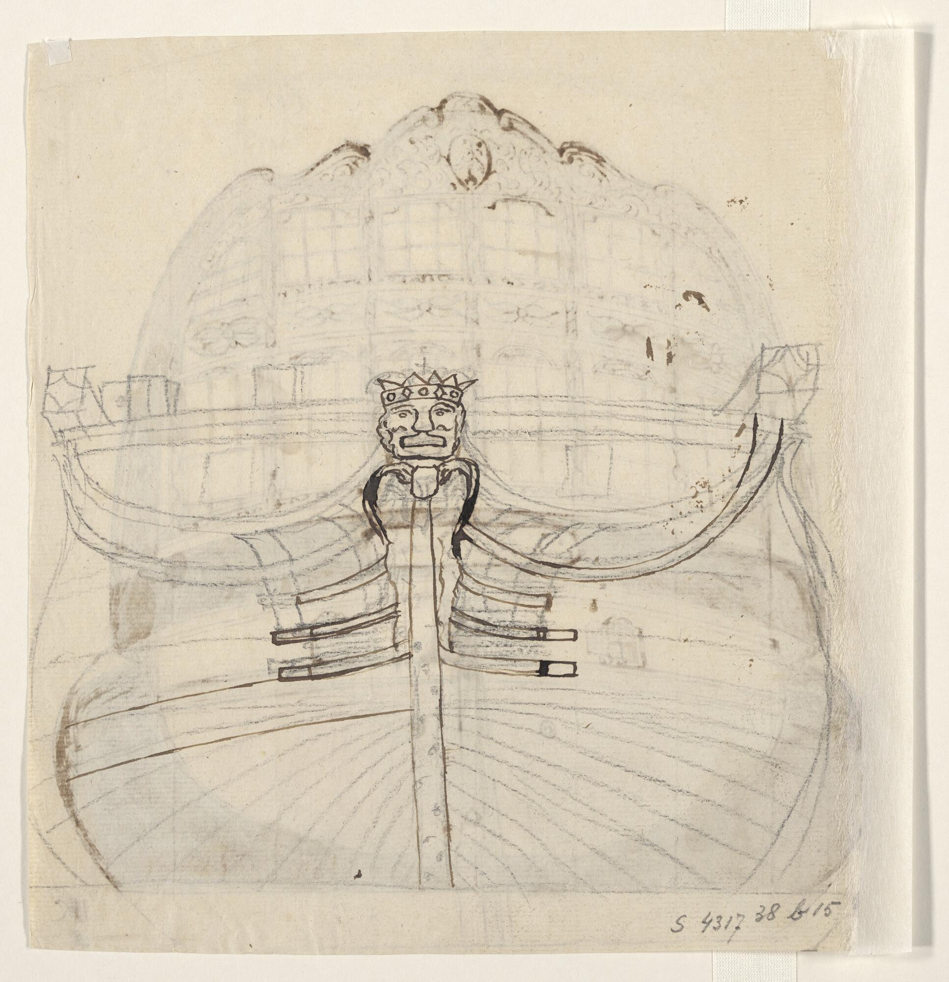 De spiegel van het schip Batavia. Verso: verm. hetzelfde schip van voren.