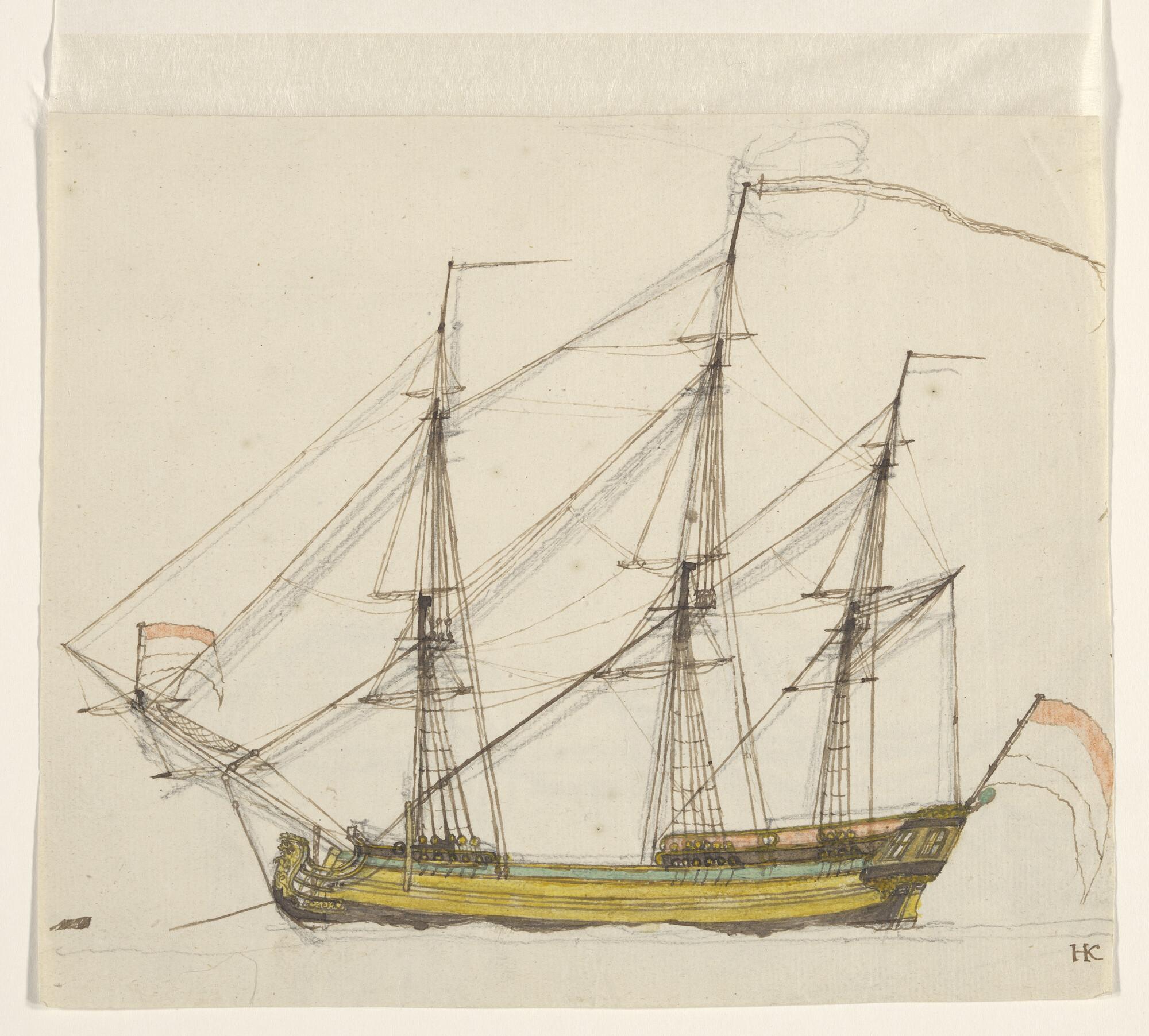 Een fregatschip. Verso: potloodschets van een schip.