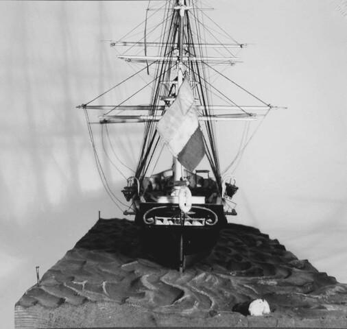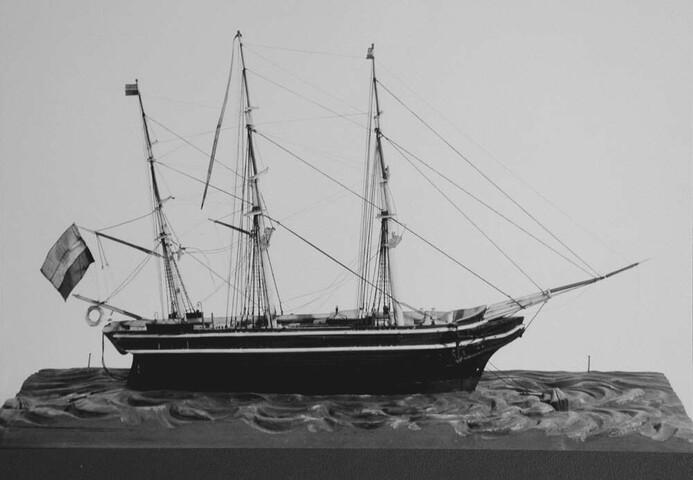 Getuigd model van het barkschip Nicolaas Witsen, circa 1850, op een nagemaakte zee.