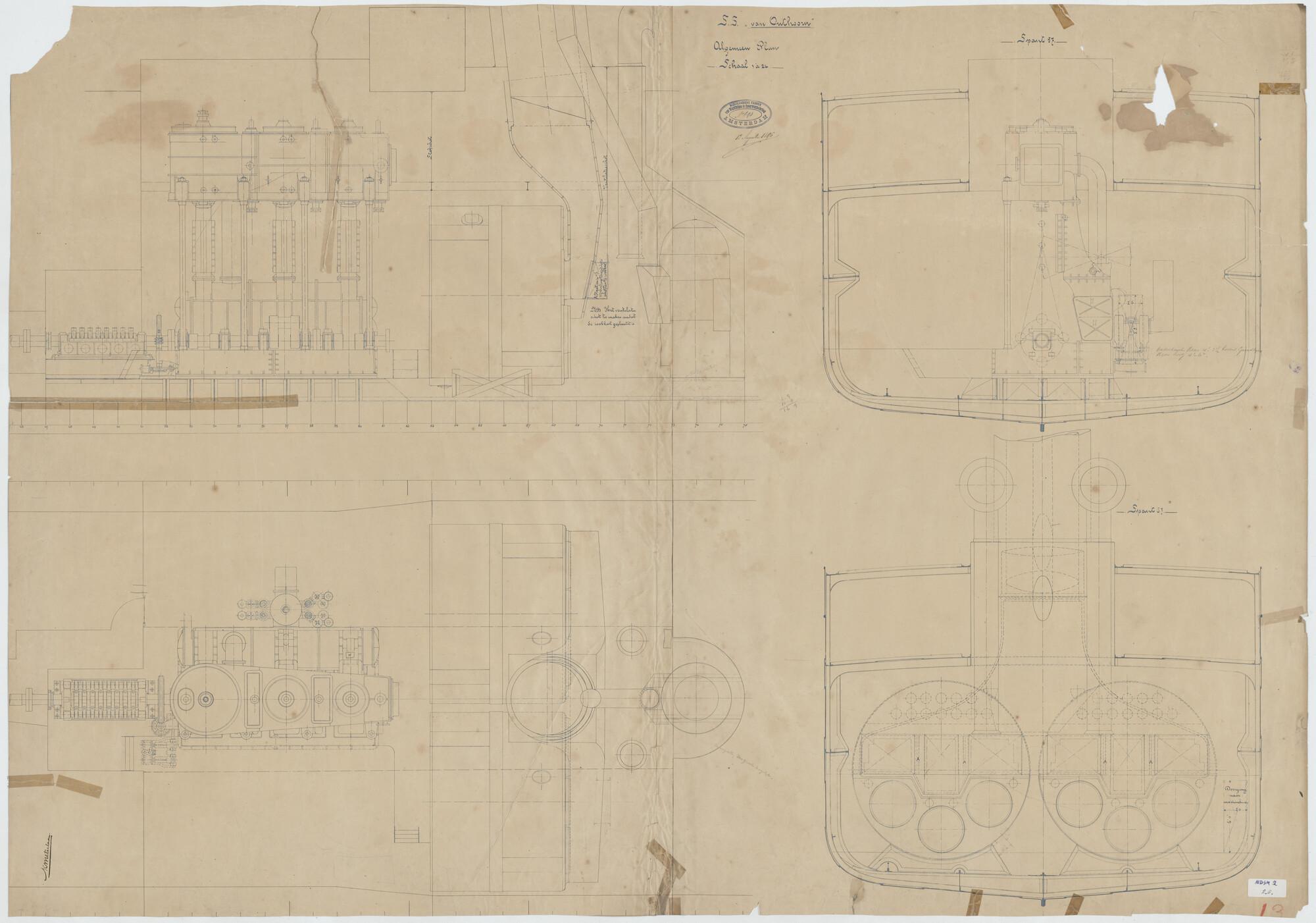 Algemeen plan, machinekamer en ketelruim van het vracht- en passagiersschip ss. Van Outshoorn van de Koninklijke Paketvaart-Maatschappij.