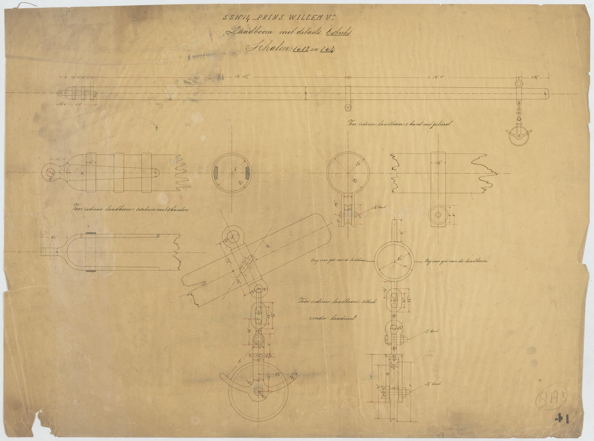 Laadboom met details van het passagiersschip ss. Prins Willem V voor de KWIM.