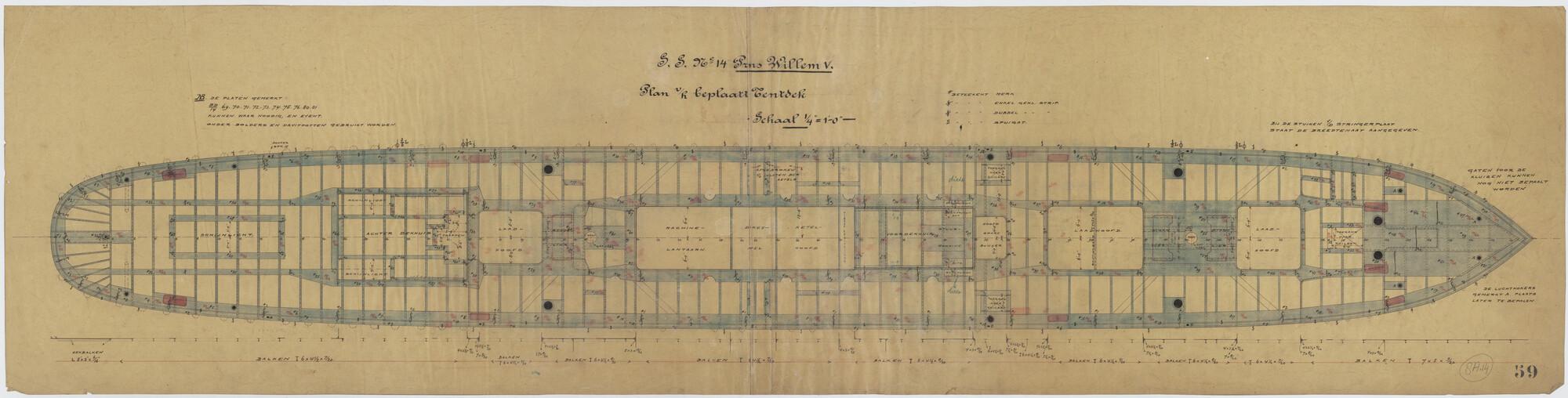 Plan van het beplaatte tentdek van het passagiersschip ss. Prins Willem V voor de KWIM