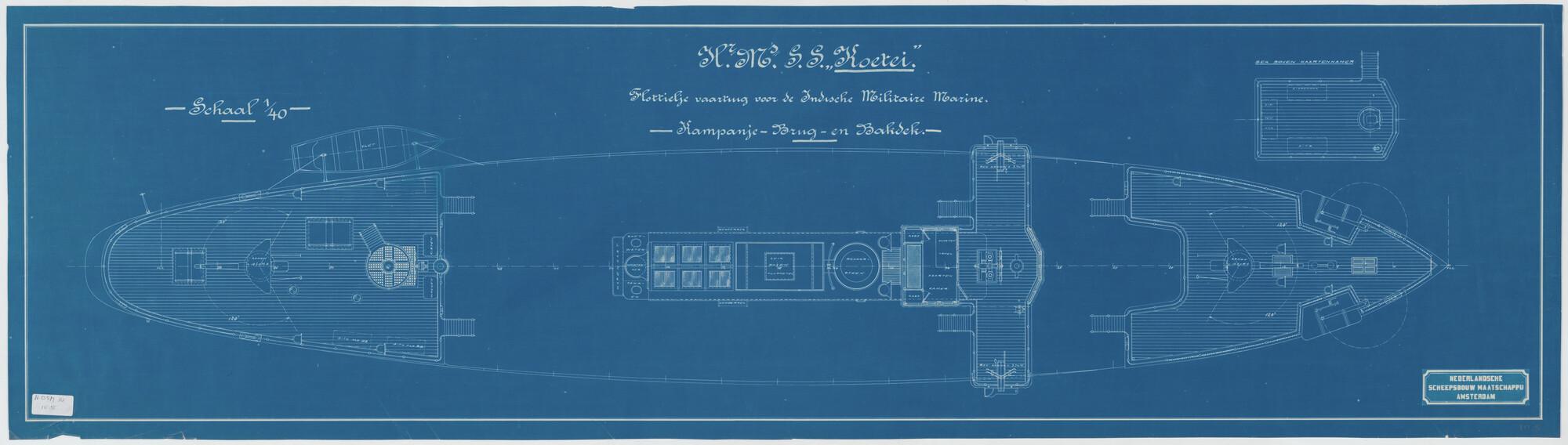 Bovenaanzicht, bovendekken, van het flottieljevaartuig Hr.Ms. Koetei voor het Departement van Marine.