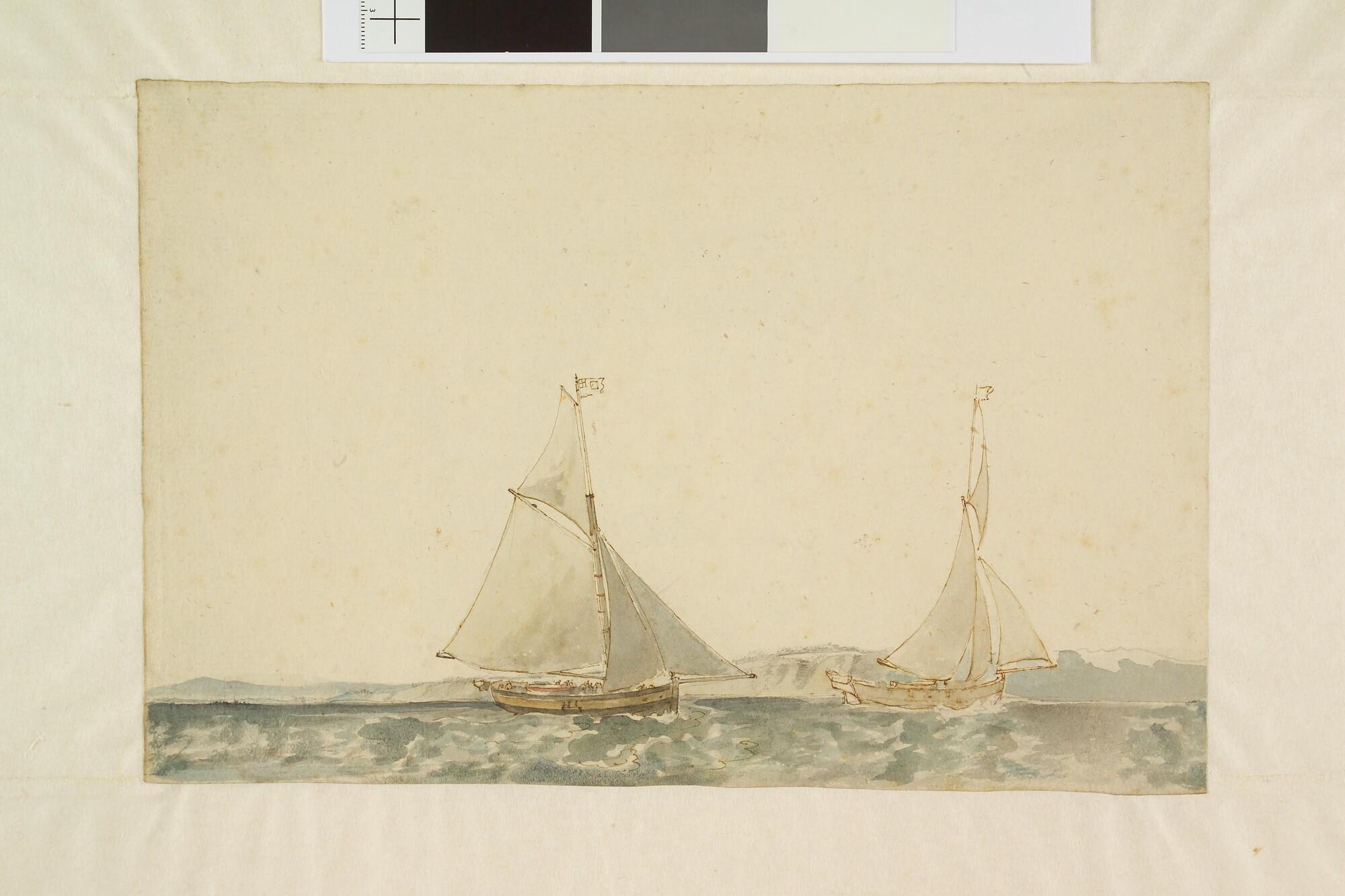 Twee Engelse kotters ter hoogte van een heuvelachtige kust.