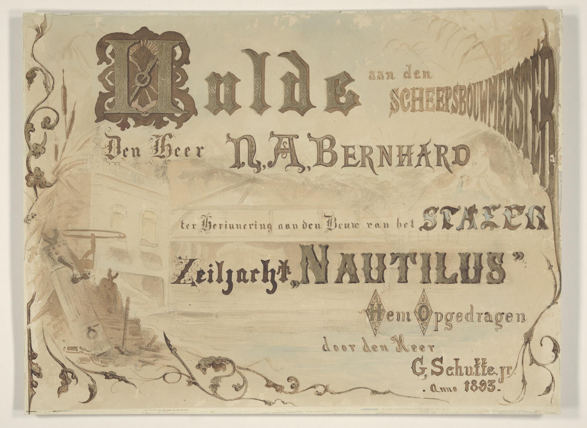 Een oorkonde als huldeblijk aan scheepsbouwmeester N.A. Bernhard, ter herinnering aan de bouw van het zeiljacht 'Nautilus'.