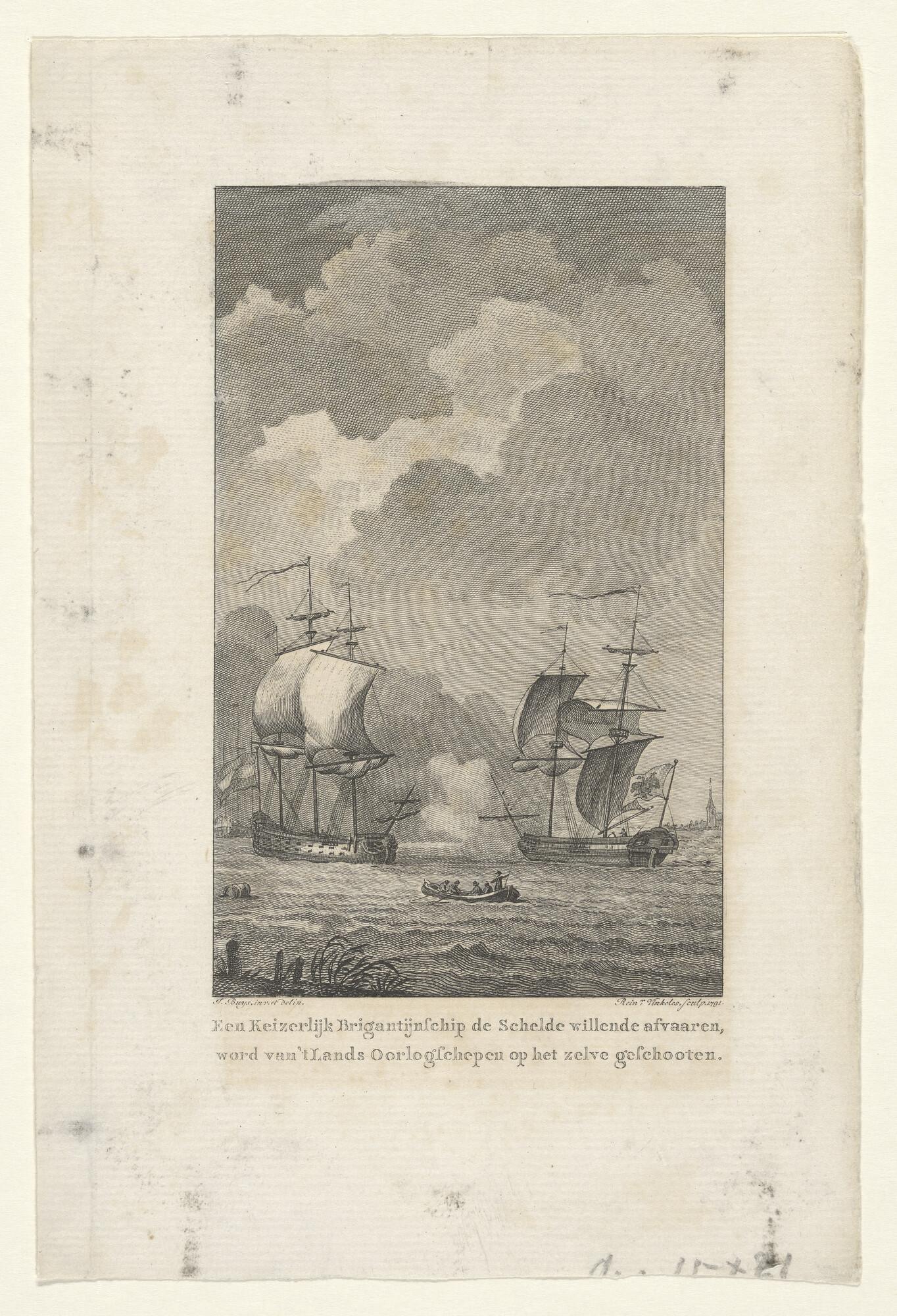 Scheepsgevecht tussen een keizerlijk brigantijnschip en een Hollands oorlogsschip.