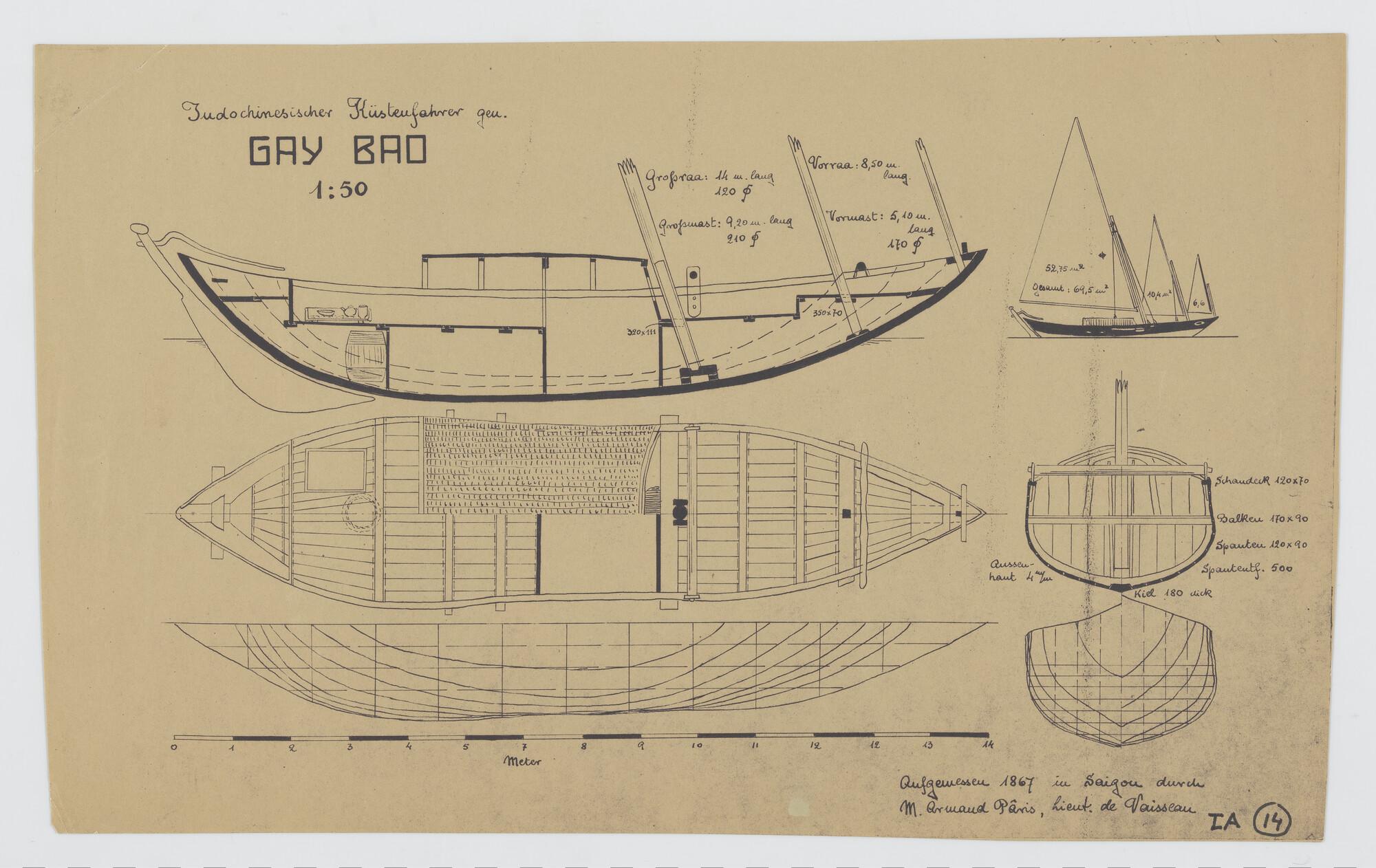 Reconstructietekeningen Caay Bao, zeilcoaster uit Indochina. Opgemeten te Saigon in 1867 door Lt. de Vaisseau Armand Paris.