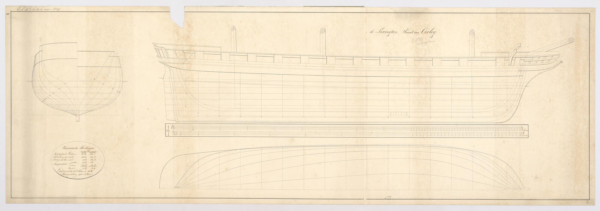 Zijaanzicht, spantenraam en waterlijnen van het korvet Lexington van 26 stukken. Afmetingen van het schip 38.76 x 10.22 x 5.03 el.