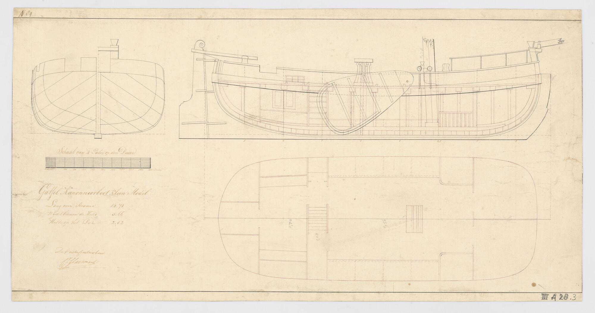 Verticale langsdoorsnede, vooraanzicht, achteraanzicht, met spantenraam van een klein model gaffelkanonneerboot.. Afmetingen van het schip 14.71 x 5.66 x 2.02 el.