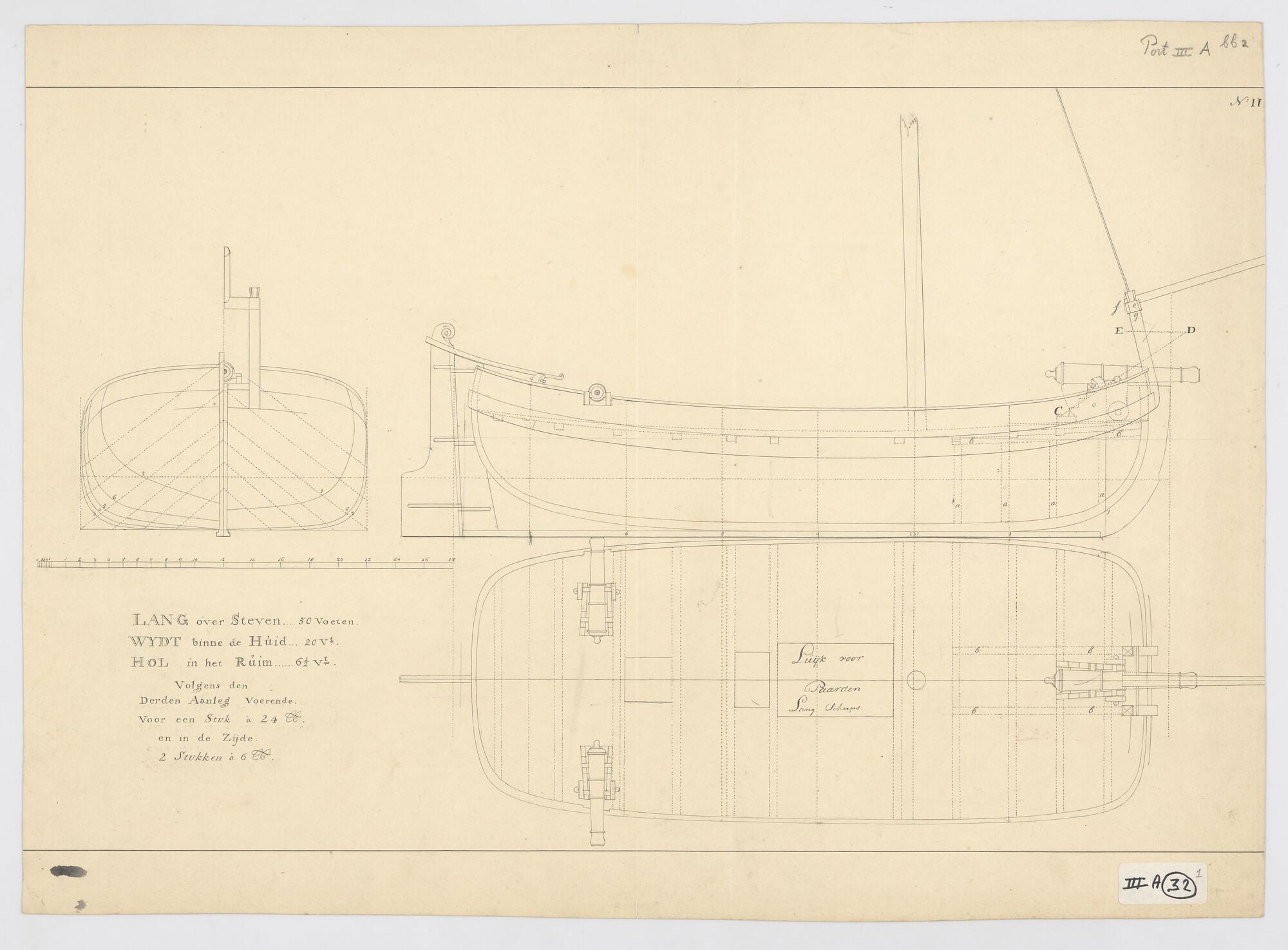 Zijaanzicht, bovenaanzicht, voor- en achteraanzicht, spantenraam en bewapening van een landingsboot, 1821. Afmetingen van het schip 56 x 20 x 6½ voeten.