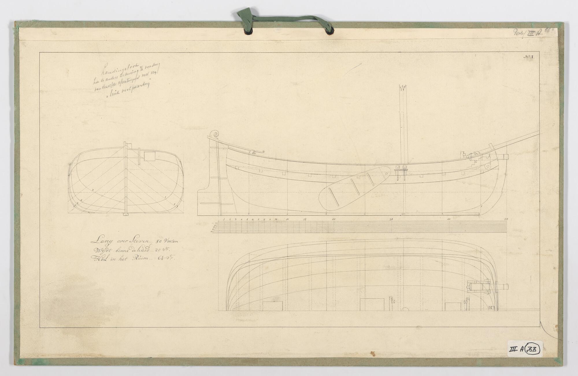 Zijaanzicht, bovenaanzicht, spantenraam, waterlijn van een landingsboot met twee kanons op het voorschip, 1821. Afmetingen 56 x 20 x 6½ voet.