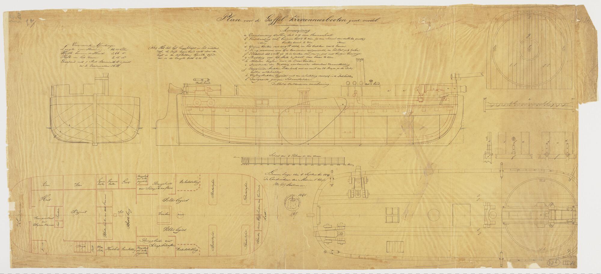 Zijaanzicht, verticale langsdoorsnede, vooraanzicht, achteraanzicht, grootspant, spantenraam, waterlijnen, senten van een gaffelkanonneerboot groot model, 1834. Afmetingen van het schip 18 x 5.66 x 2.15 el.