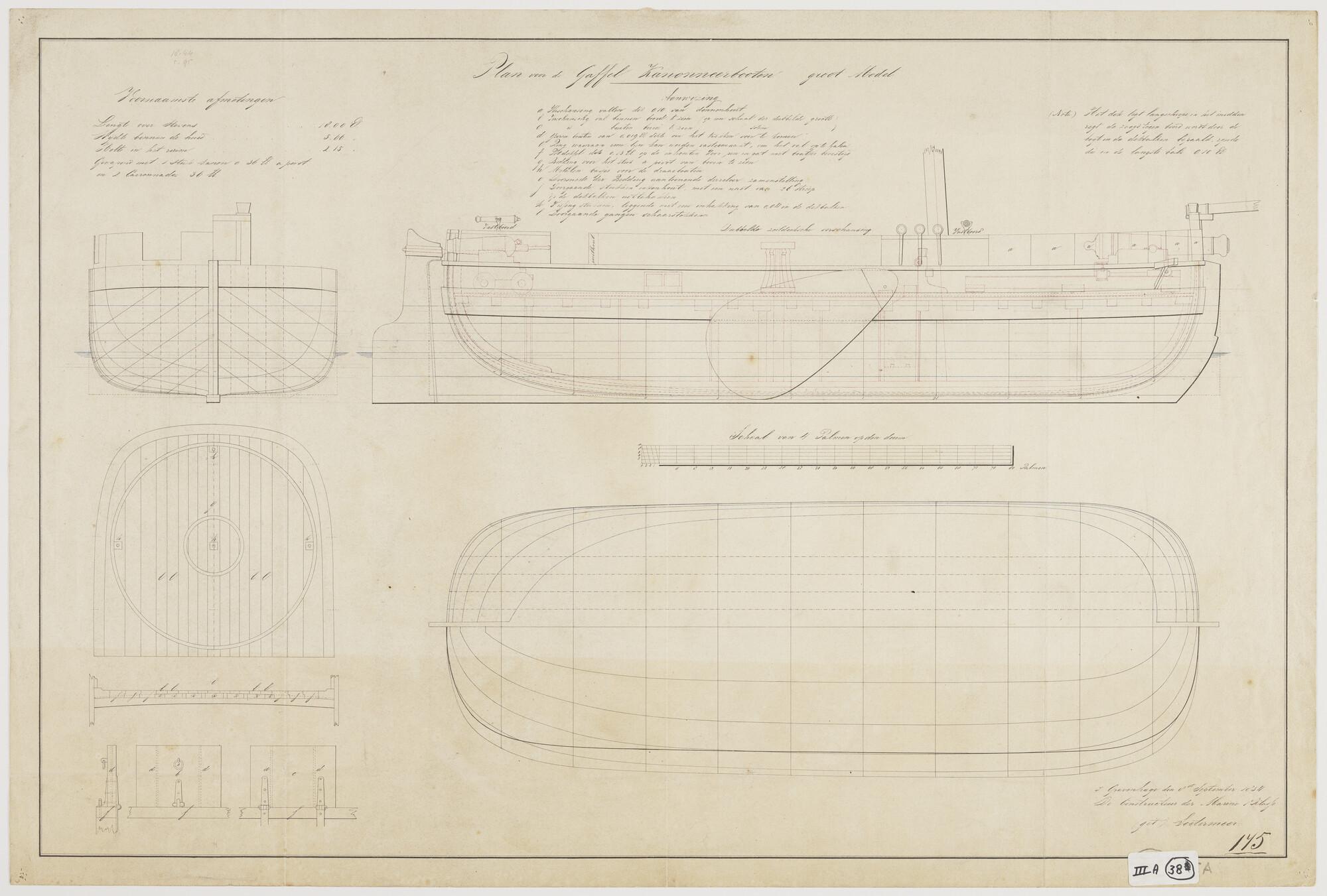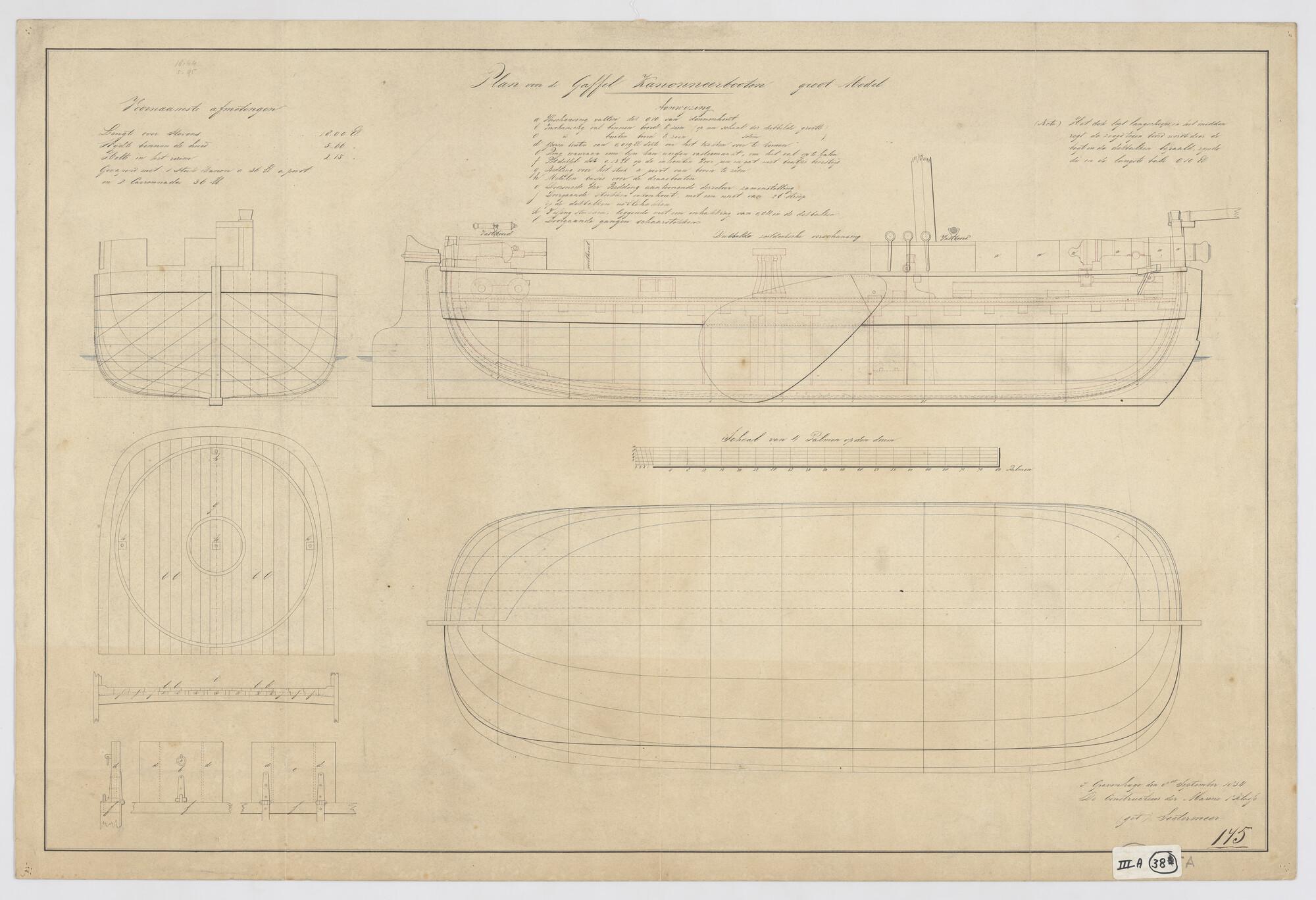 Zijaanzicht, verticale langsdoorsnede, vooraanzicht, achteraanzicht, grootspant, spantenraam, waterlijnen, senten, bovenaanzicht en horitzontale langsdoorsnede van een gaffelkanonneerboot groot nieuw model, 1834. Afmetingen van het schip 18 x 5.66 x 2.15 el.