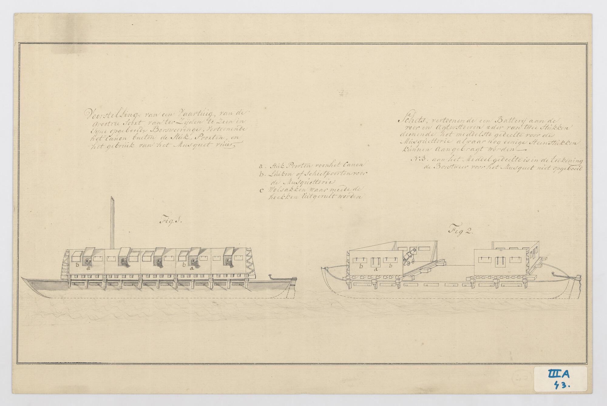 Zijaanzicht, en perspectief-doorsnede van een roeilandingsvaartuig