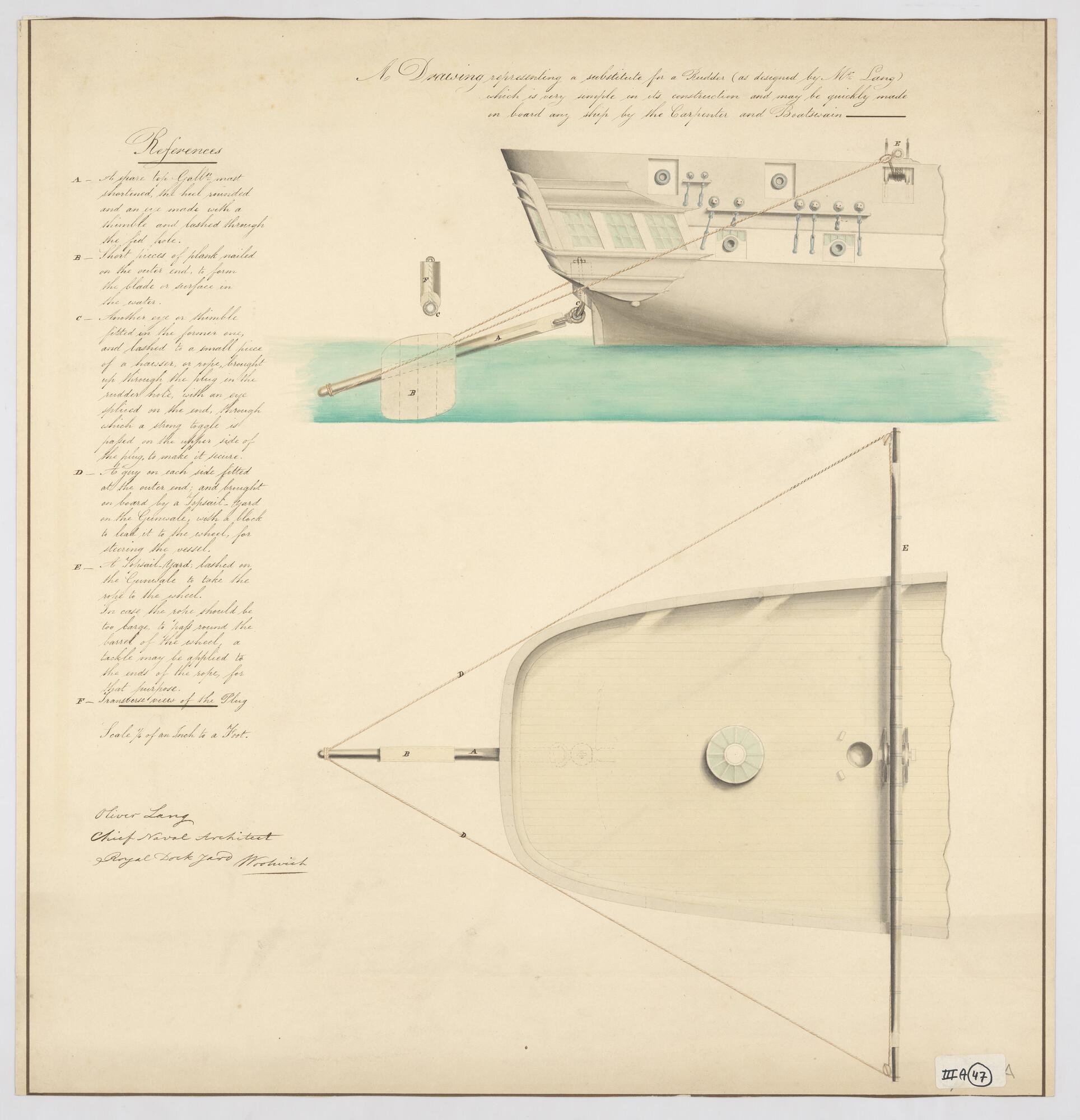 Boven- en zijaanzicht van een oorlogsschip met een vereenvoudigde constructie voor een noodroer, door de Engelse scheepsontwerper Oliver Lang.