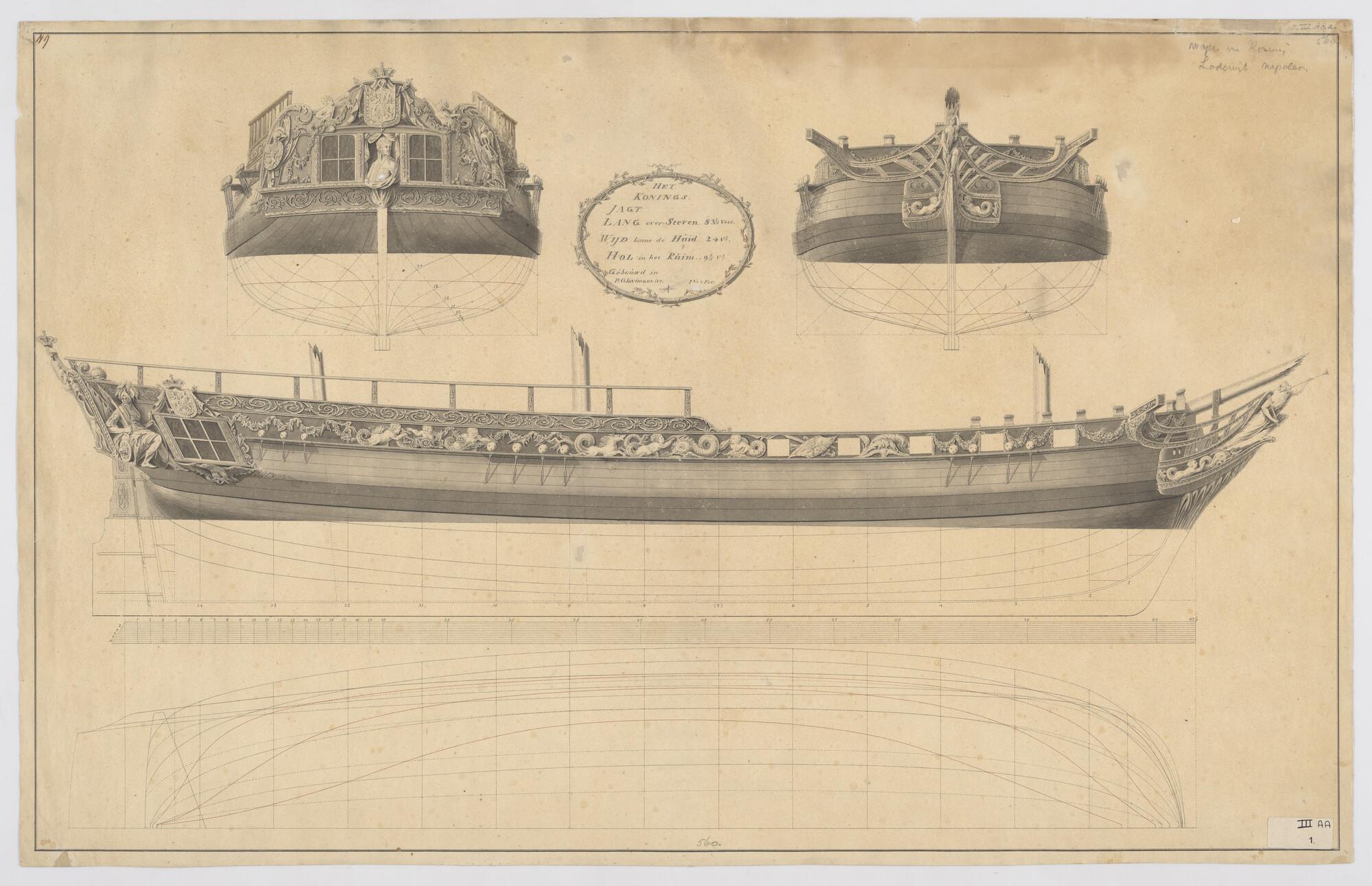 Zijaanzicht, vooraanzicht, achteraanzicht, spantenraam, senten, waterlijnen van het driemast koningsjacht, lengte 83 voet, voor koning Lodewijk Napoleon.