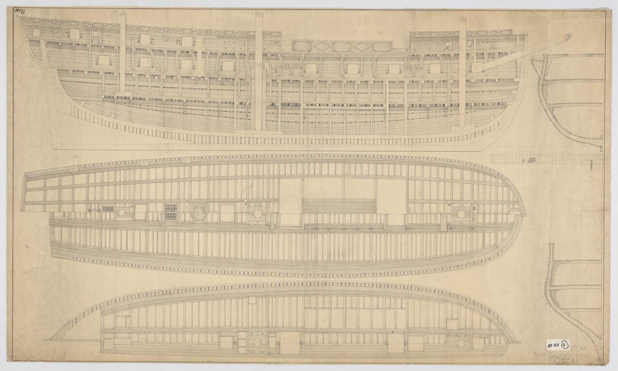 Verticale langsdoorsnede, horizontale langsdoorsnede van het korvet 'Lynx' van 28 stukken, 1816.